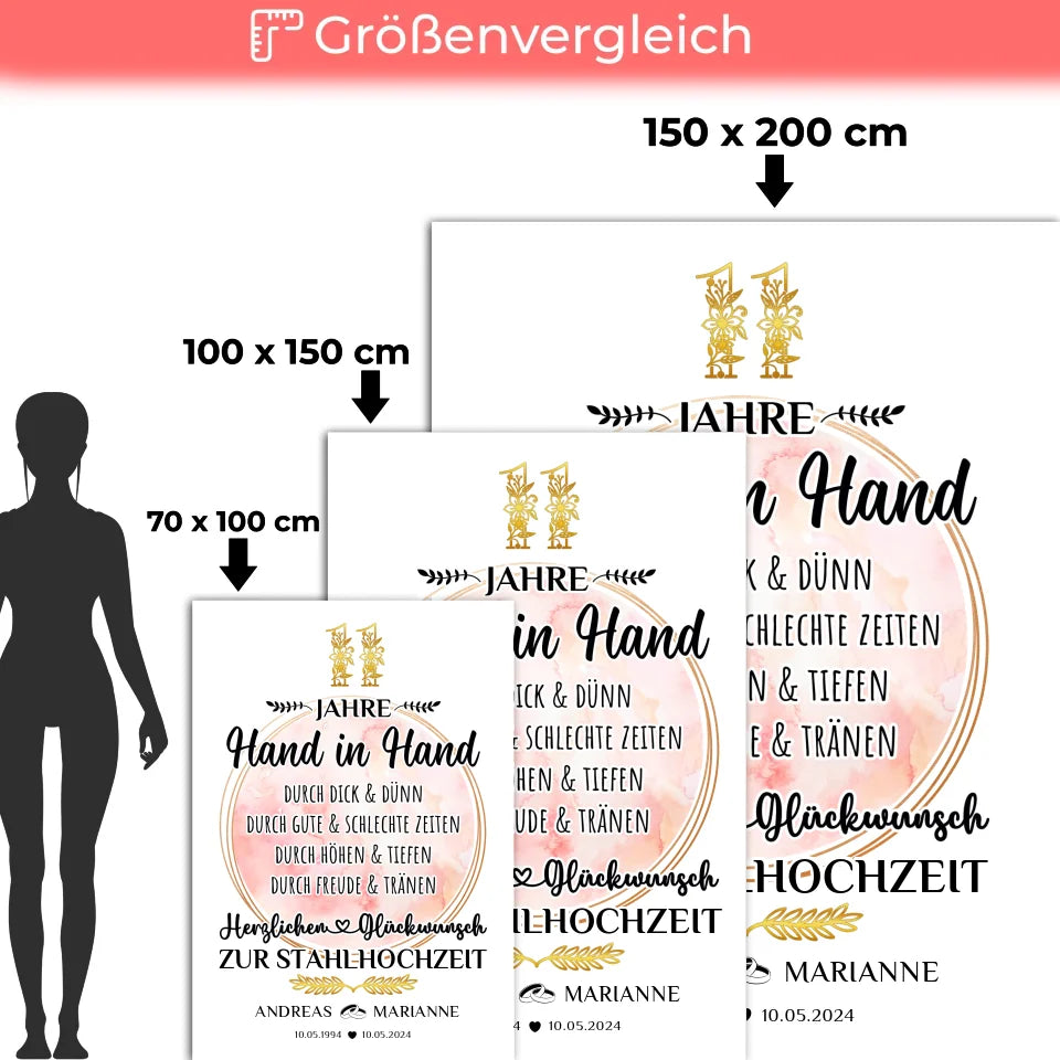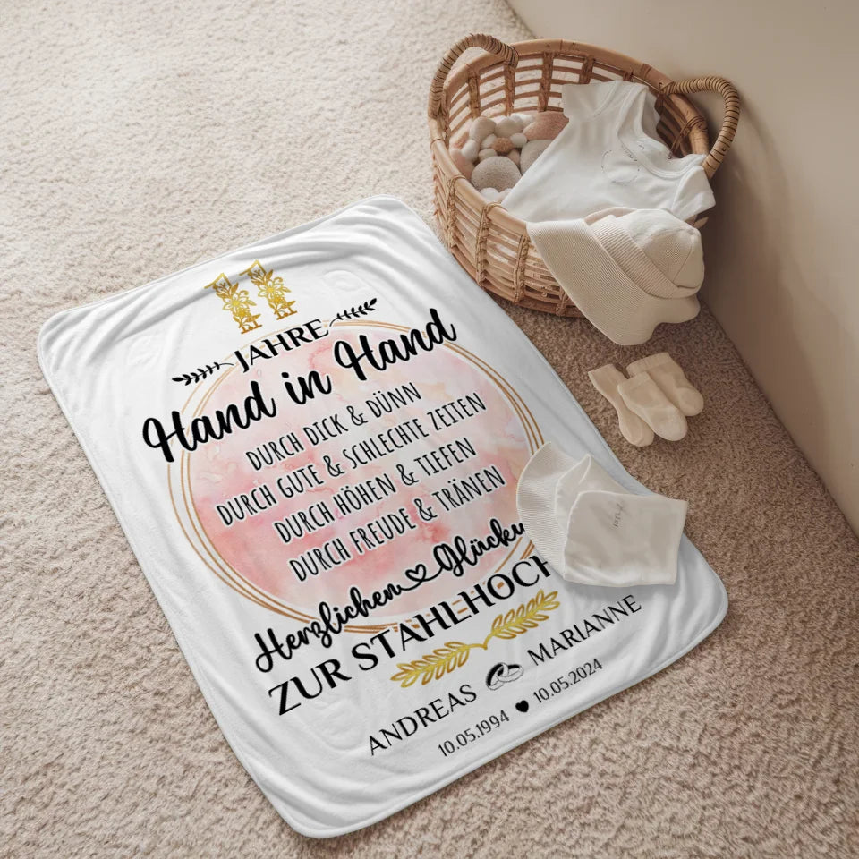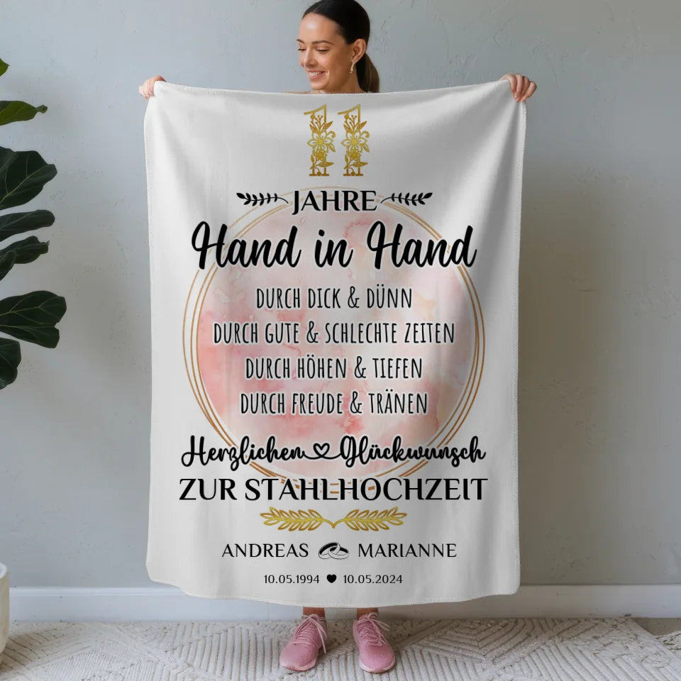 Feiere den 11. Hochzeitstag mit einer einzigartigen, personalisierten Decke, die speziell für deine besondere Beziehung entworfen wurde. Diese liebevolle Decke ist das perfekte Geschenk zur Stahlhochzeit und wird mit euren Namen, dem Datum eurer Hochzeit sowie dem Hochzeitsjahr individuell gestaltet. Mit der Aufschrift 'Hand in Hand' wird sie zum Ausdruck eurer gemeinsamen Reise und der tiefen Verbundenheit, die ihr über die Jahre aufgebaut habt. Ob als romantische Überraschung oder als liebevolles Geschenk zum Hochzeitstag – diese Decke ist sowohl praktisch als auch ein wunderschöner Blickfang in jedem Zuhause. Verschenke nicht einfach ein Geschenk, sondern ein Stück eurer gemeinsamen Geschichte mit dieser personalisierten Decke, die euch immer an eure unvergesslichen Momente erinnert. Ideal für Paare, die ihren 11. Hochzeitstag gebührend feiern möchten, ist diese Decke ein Ausdruck von Liebe und Fürsorge. Überrasche deinen Partner oder deine Partnerin mit einem Geschenk, das nicht nur Wärme spendet, sondern auch eure einzigartigen Erinnerungen bewahrt!