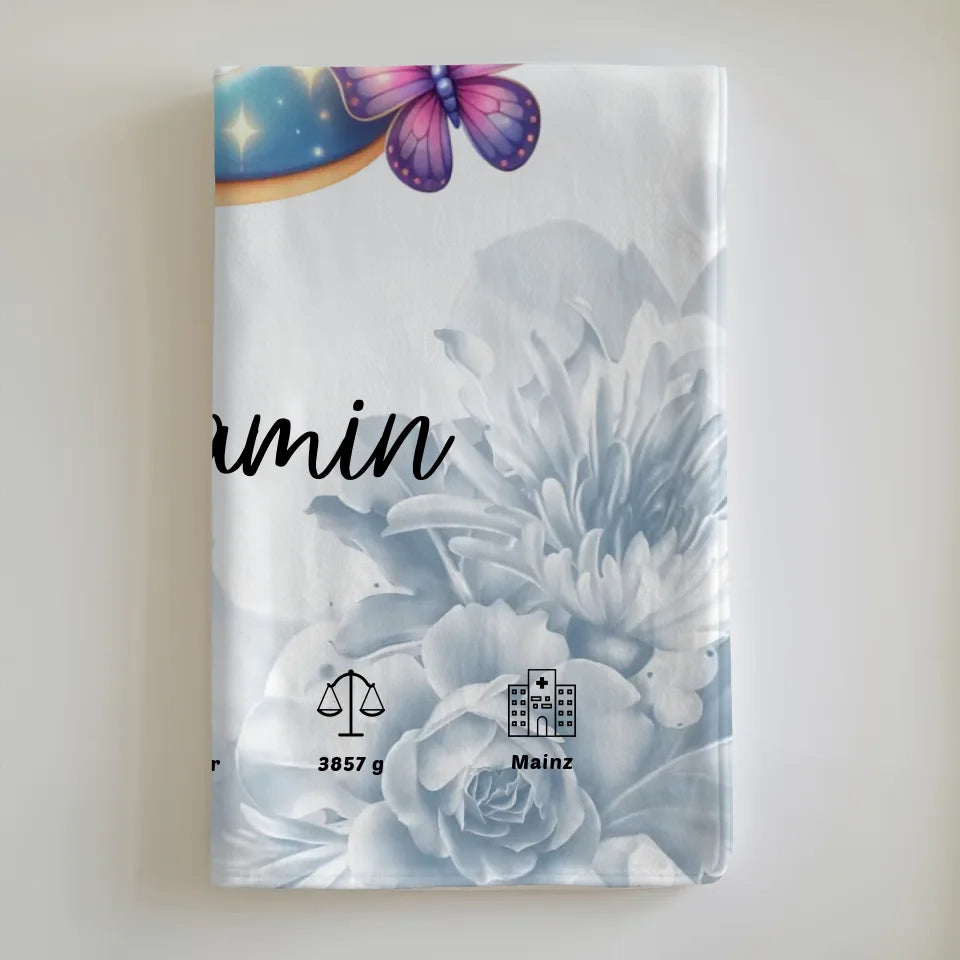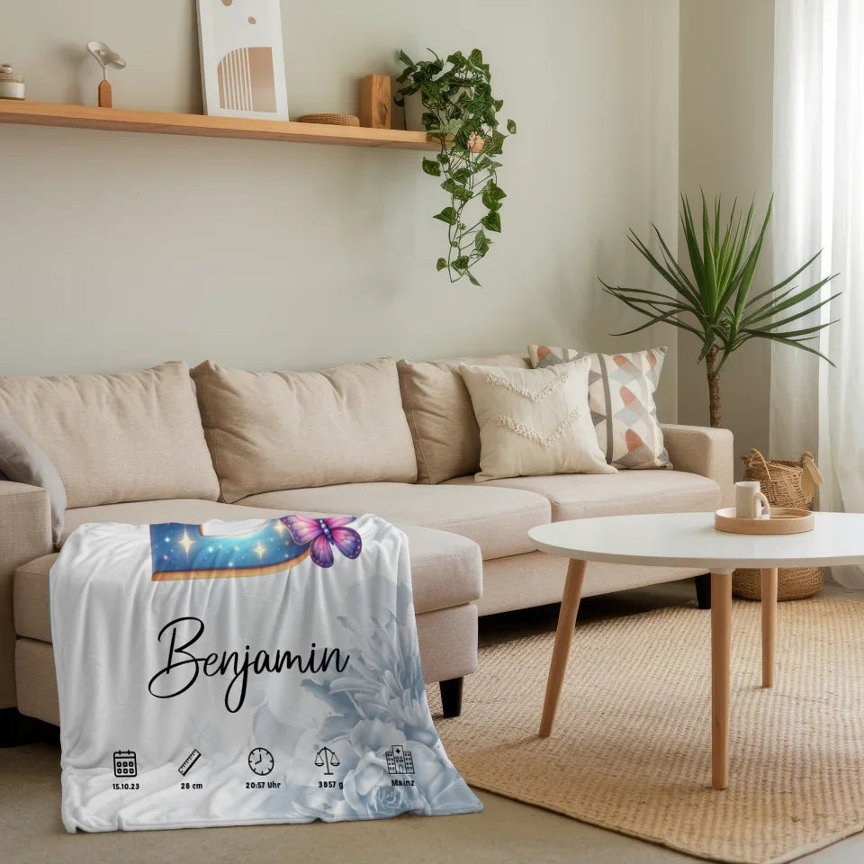Suchst du nach einem einzigartigen und personalisierten Geschenk? Unsere personalisierte Decke mit Anfangsbuchstaben B und blauen Blüten ist die perfekte Wahl für besondere Anlässe! Diese stilvolle Decke bietet dir die Möglichkeit, wertvolle Geburtsdaten wie Gewicht, Größe, Uhrzeit und Datum individuell zu verewigen. Zusätzlich kannst du den Initial Buchstaben & Name des Beschenkten gestalten. Mit wunderschönen blauen Blüten und dem Buchstaben B wird diese Decke nicht nur zum praktischen Begleiter, sondern auch zu einem echten Blickfang in jedem Raum.
