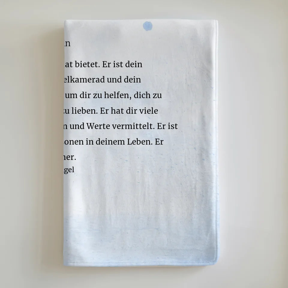 Gestalte die Decke ganz nach deinen Wünschen! Du kannst nicht nur den Namen deines Opas hinzufügen, sondern auch das Hintergrundbild wählen, das am besten zu ihm passt. Damit wird die Decke zu einem ganz persönlichen Unikat, das zeigt, wie viel dir dein Opa bedeutet. Die Farbspritzer Blau verleihen der Decke einen modernen Touch, der in jedes Zuhause passt.