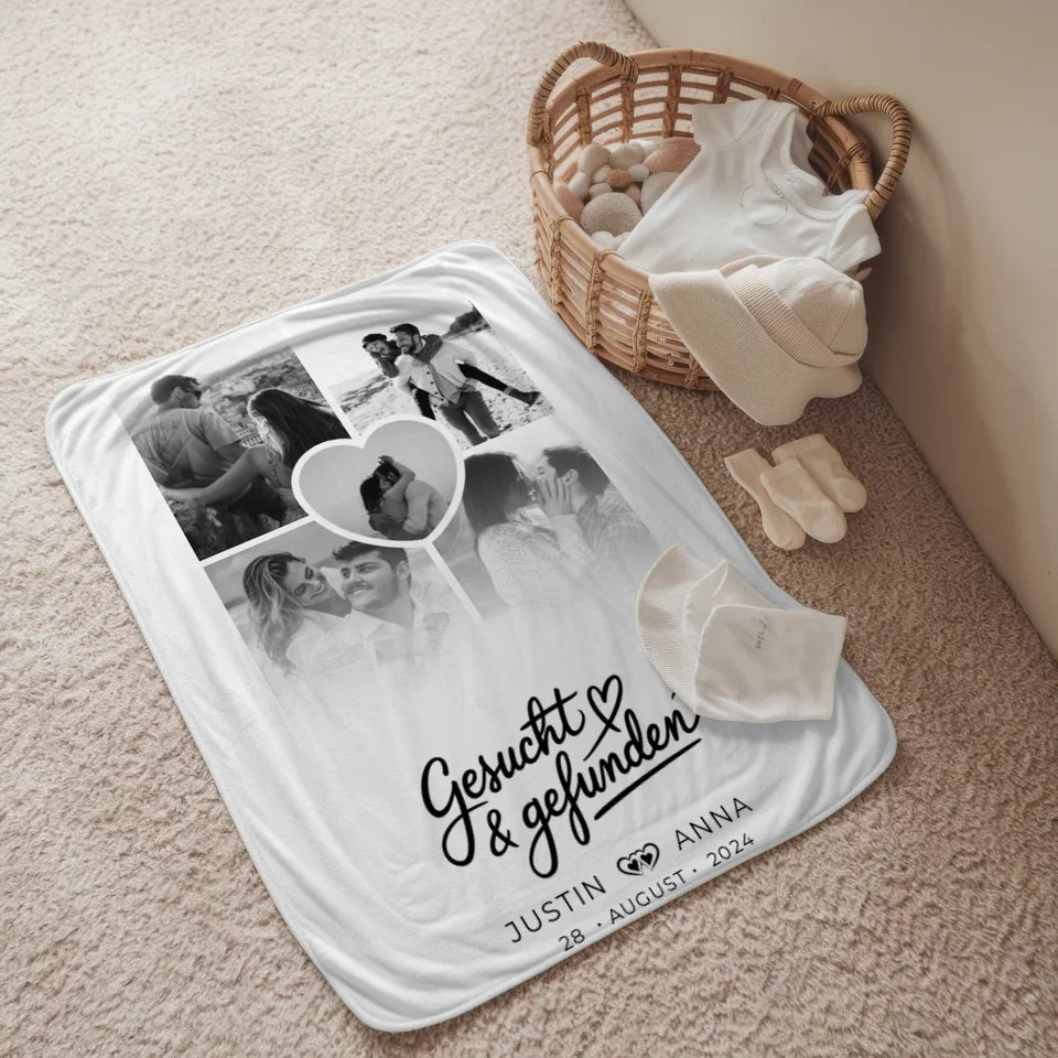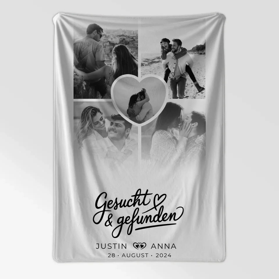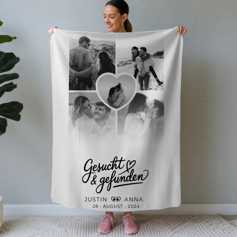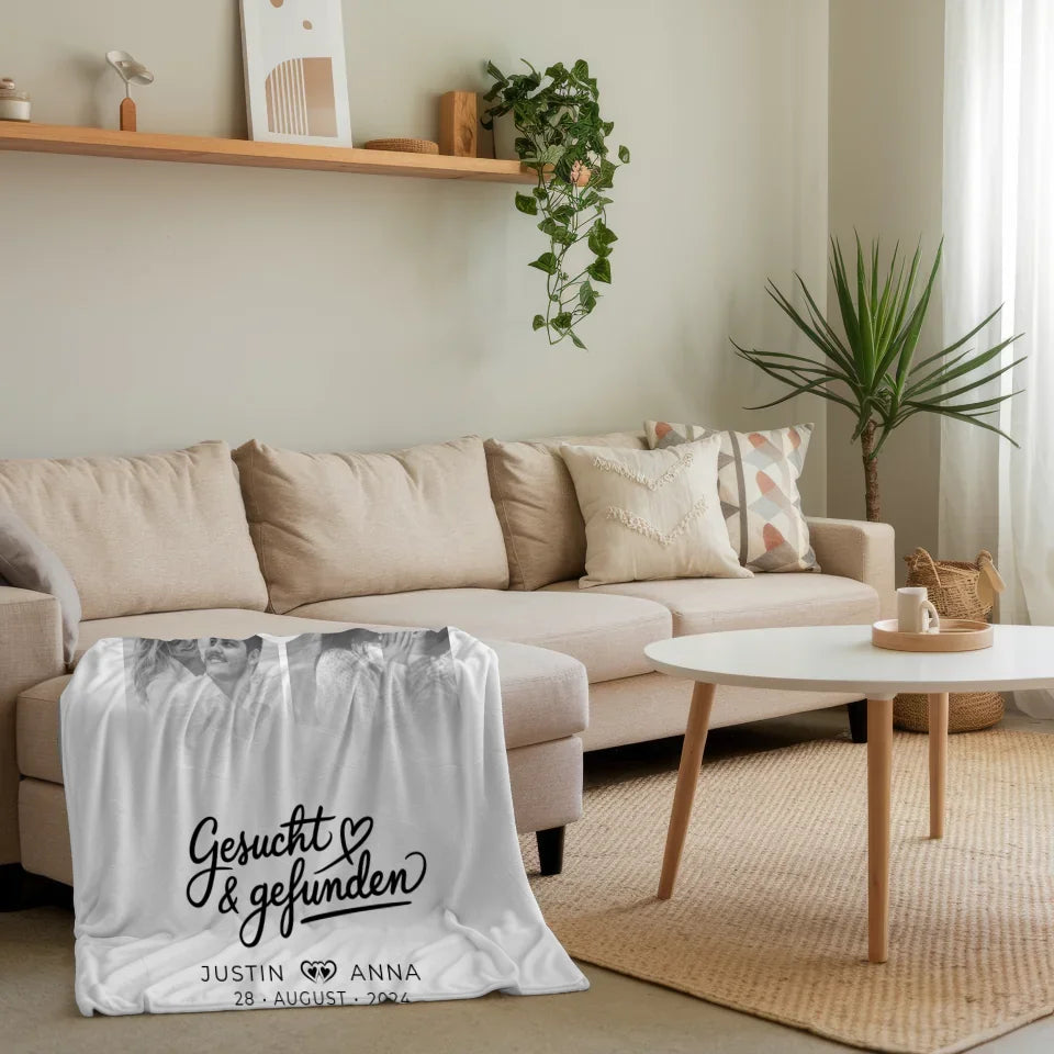 Diese personalisierte Decke ist ideal für jeden besonderen Anlass – sei es zum Valentinstag, zum Geburtstag oder als liebevolles Weihnachtsgeschenk. Das Design wird durch den schönen Spruch 'Gesucht & Gefunden' abgerundet, der die Liebe und Verbundenheit zwischen Paaren perfekt beschreibt. Hol dir jetzt deine individuelle Decke und verschenke ein Stück deiner Geschichte! Mit unserer personalisierten Decke schaffst du unvergessliche Erinnerungen, die dich überraschen und begeistern werden.