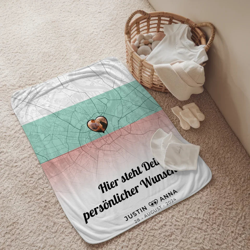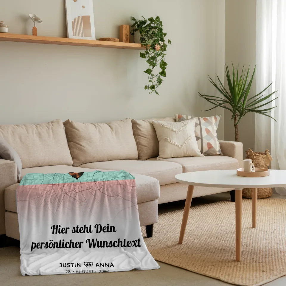 Jede Decke wird nach deinen Wünschen angefertigt, sodass du ein einzigartiges Stück erhältst, das eure gemeinsame Geschichte erzählt. Mit der Kombination aus einer Stadtkarte, deinem Lieblingsfoto und einem persönlichen Text wird diese Decke zum besonderen Erinnerungsstück, das du immer wieder gerne hervorholst. Lass deiner Kreativität freien Lauf und kreiere ein schenkwürdiges Unikat!