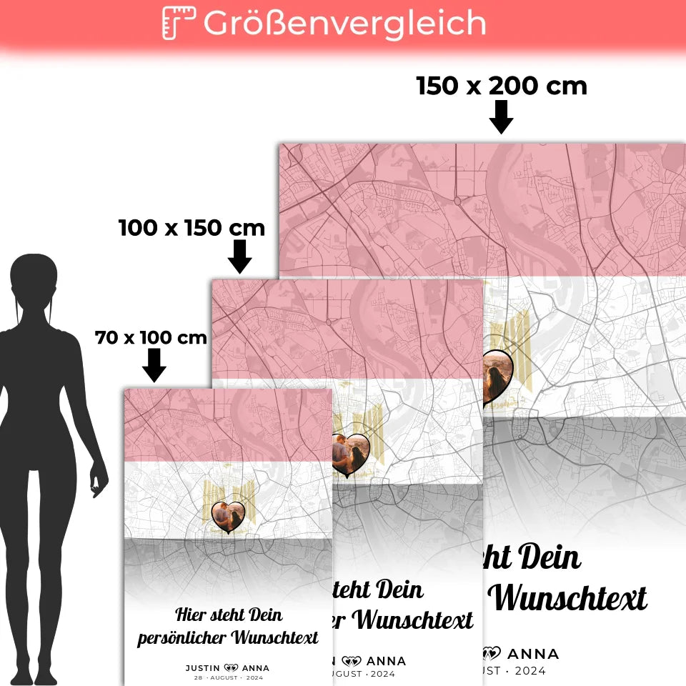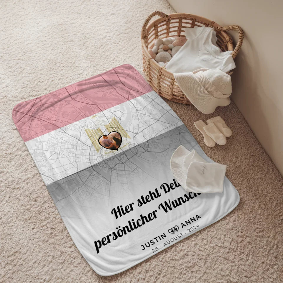 Bei der personalisierten Decke hast du die Möglichkeit, sie nach deinen Wünschen zu gestalten. Wähle ein Foto, eine Stadtkarte mit eurem besonderen Ort in Ägypten, füge eure Namen hinzu und überrasche mit einem eigenen Spruch oder Wunschtext. Die passende Länderflagge rundet das Design ab und macht es zu einem echten Unikat.