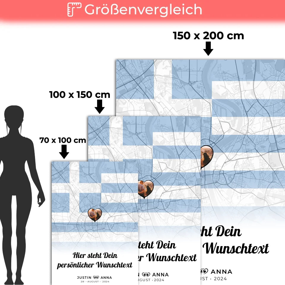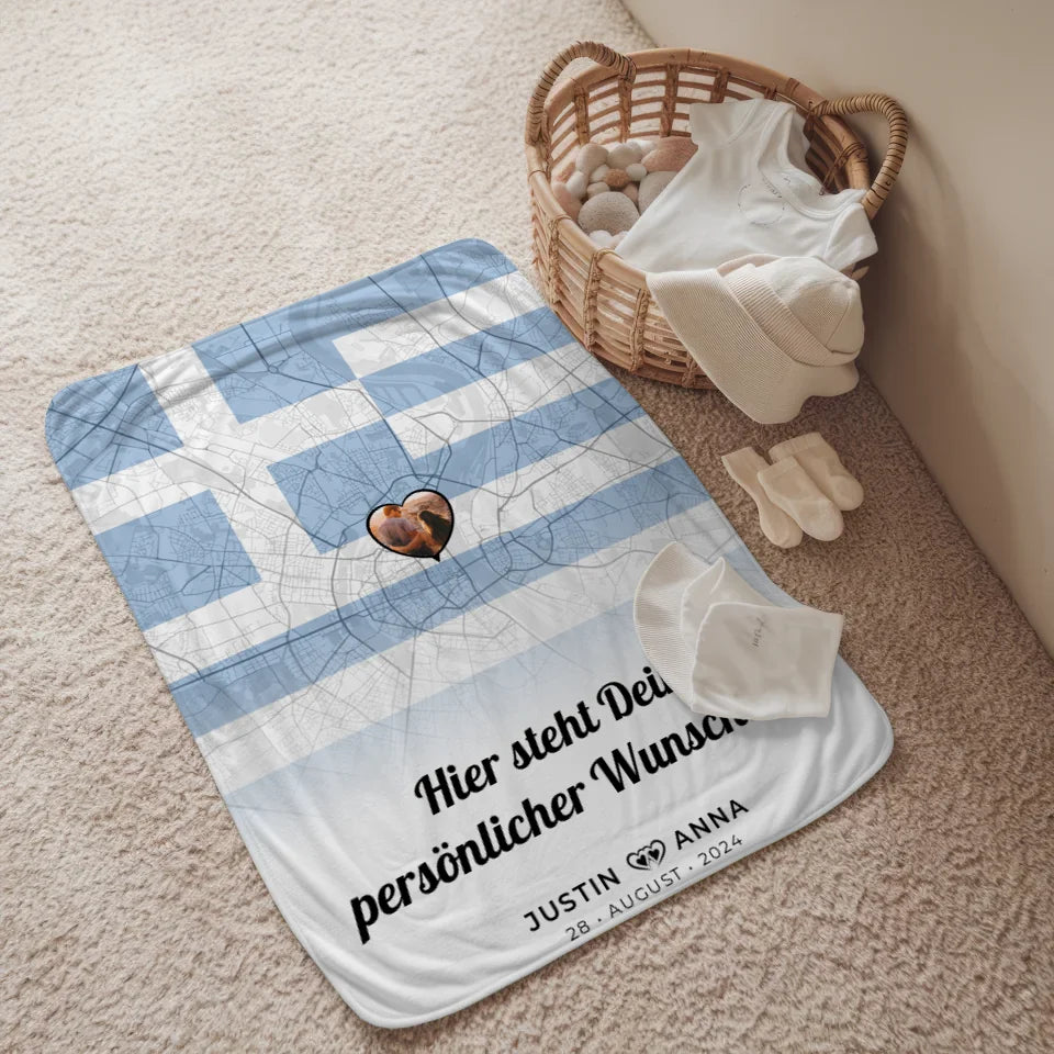 Du kannst die Decke ganz nach deinen Wünschen gestalten. Wähle ein Lieblingsfoto, füge eine Stadtkarte von einem besonderen Ort in Griechenland hinzu und verewige die Namen des Paares sowie einen eigenen Spruch oder Wunschtext. Die Möglichkeit, auch die Länderflagge auszuwählen, verleiht der Decke eine persönliche Note und erinnert an den Traumurlaub oder die schönsten gemeinsamen Momente.