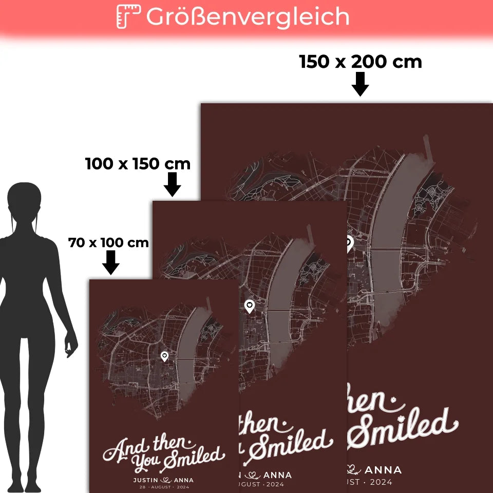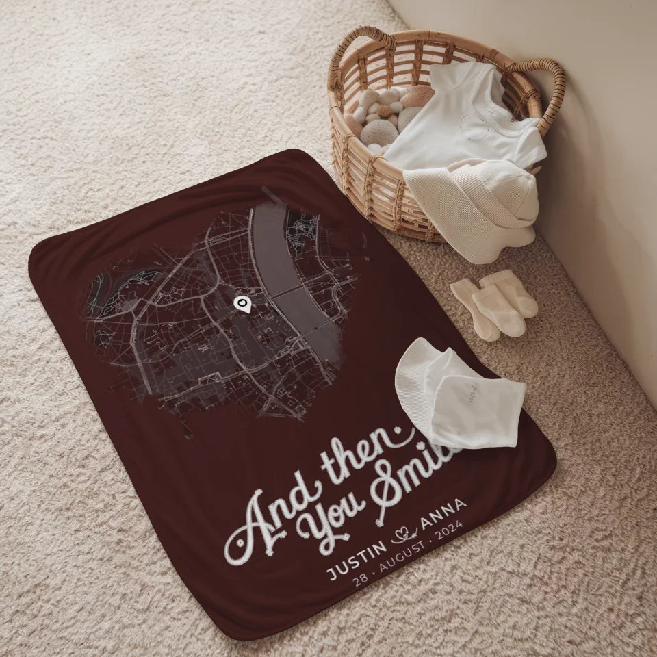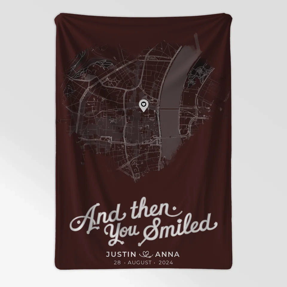 Mach eine Geschenkidee einzigartig und klicke jetzt, um deine personalisierte Decke Paare Stadtkarte Herzform „And Then You Smiled“ zu gestalten und die Herzen deiner Liebsten höher schlagen zu lassen!