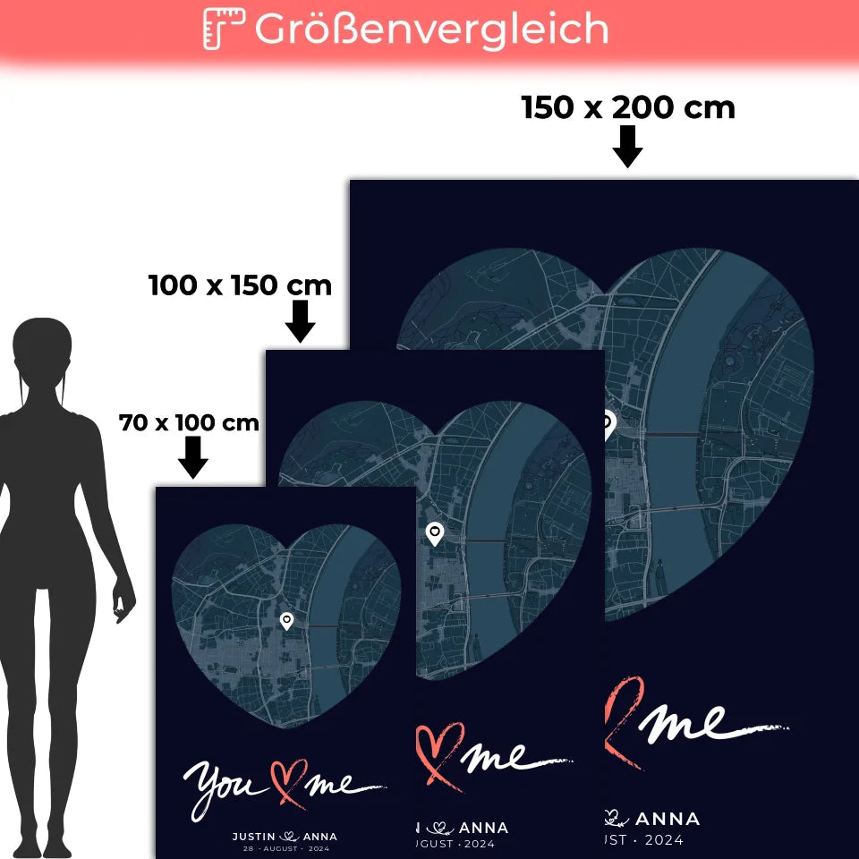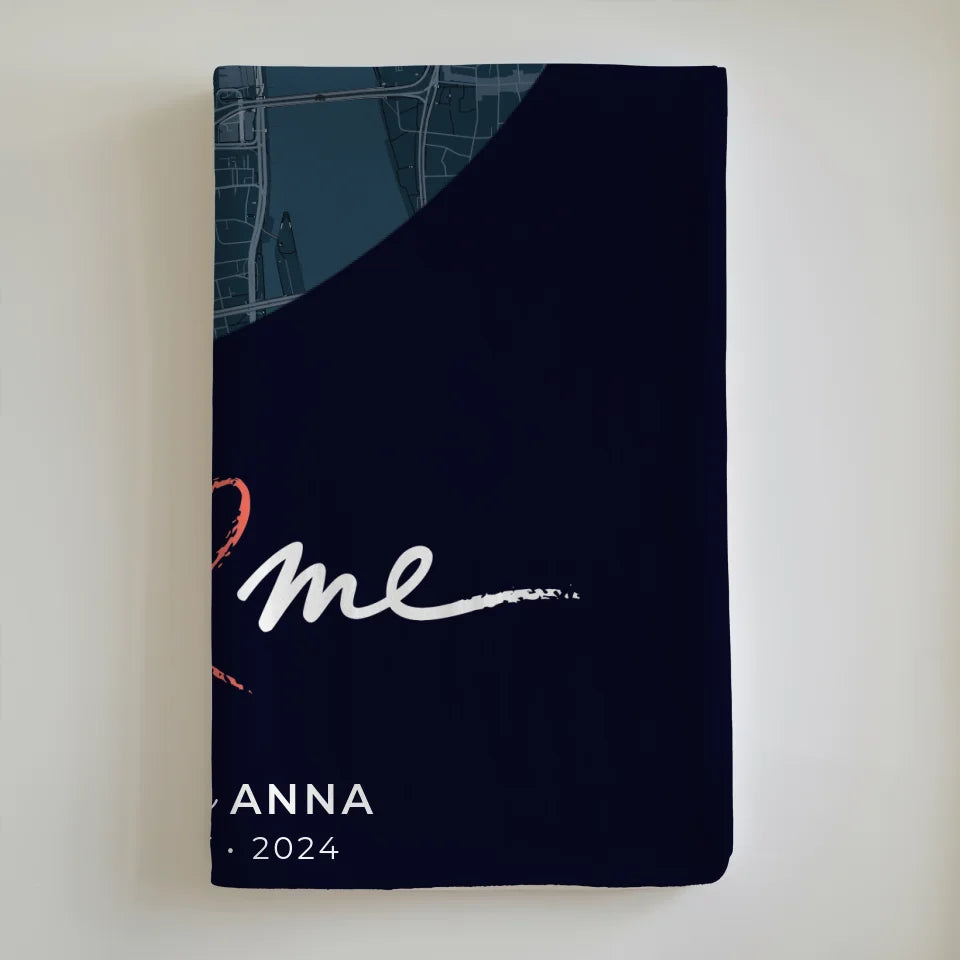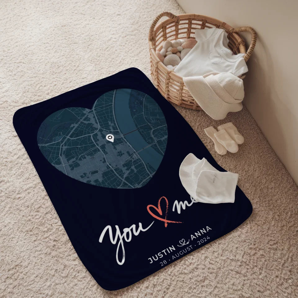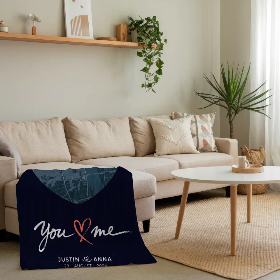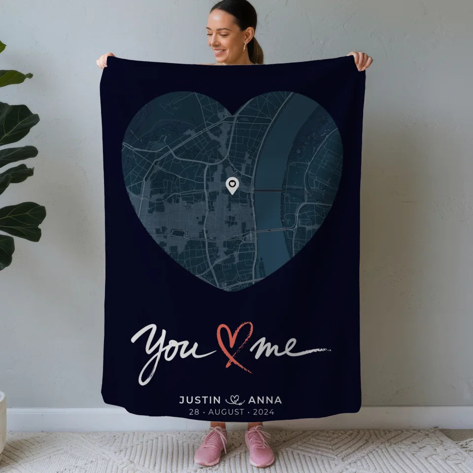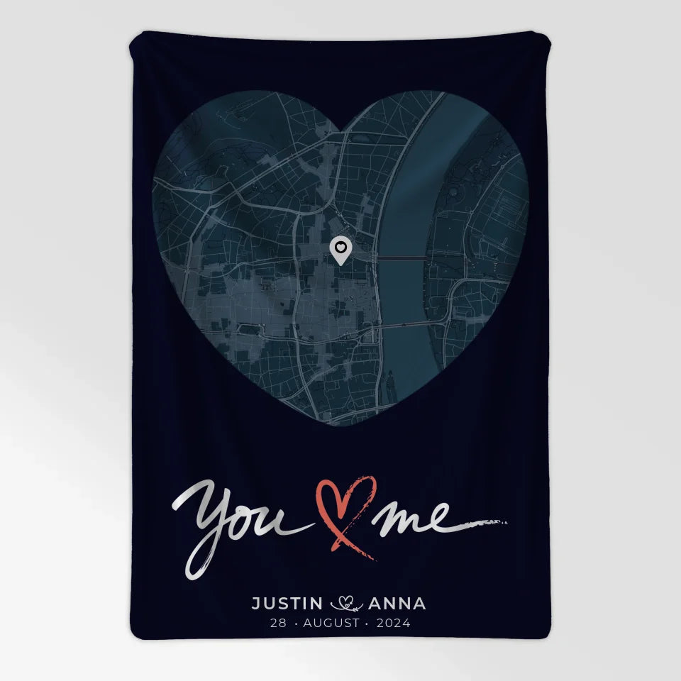 Personalisierte Decke Paare Stadtkarte Herzform You & Me Blau