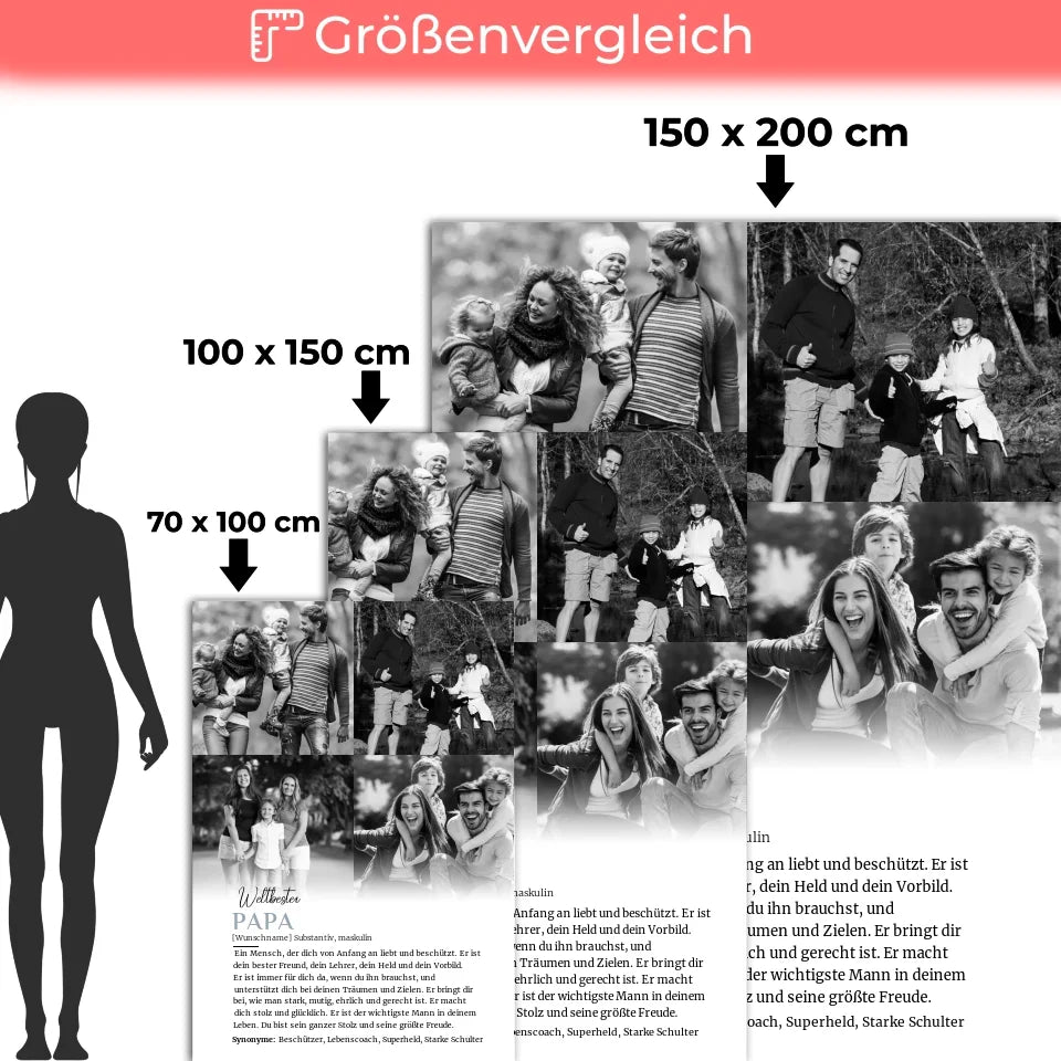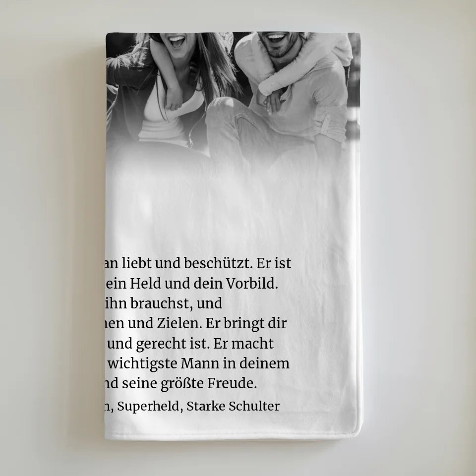 Überrasche deinen Papa mit einer einzigartigen und liebevollen Überraschung: der personalisierten Decke Papa Definition mit 4 Fotos und Name. Diese Decke ist nicht nur ein praktisches Geschenk, sondern auch ein echtes Unikat, das die besten Momente eurer gemeinsamen Zeit festhält. Deine persönliche Note macht diese Decke zu einem besonderen Erinnerungsstück, das in jeder Situation für Gemütlichkeit sorgt. Ob als Geburtstagsgeschenk, zu Weihnachten oder zum Vatertag – dieses Geschenk wird garantiert für Freude und ein Lächeln sorgen. Die Decke wird mit der Definition von „Papa“ bedruckt und kann mit 4 Fotos und dem Namen deines Vaters individuell gestaltet werden. Lass diesen besonderen Moment lebendig werden und schaffe mit dieser personalisierten Decke unvergessliche Erinnerungen. Jeder Papa wird es lieben, sich in diese kuschelige Decke zu hüllen und die persönlichen Erinnerungen zu betrachten. Hol dir jetzt die personalisierte Decke und zeige deinem Papa, wie wichtig er dir ist!