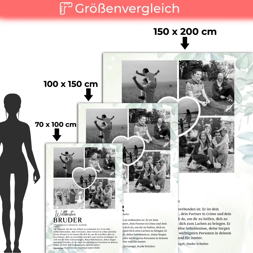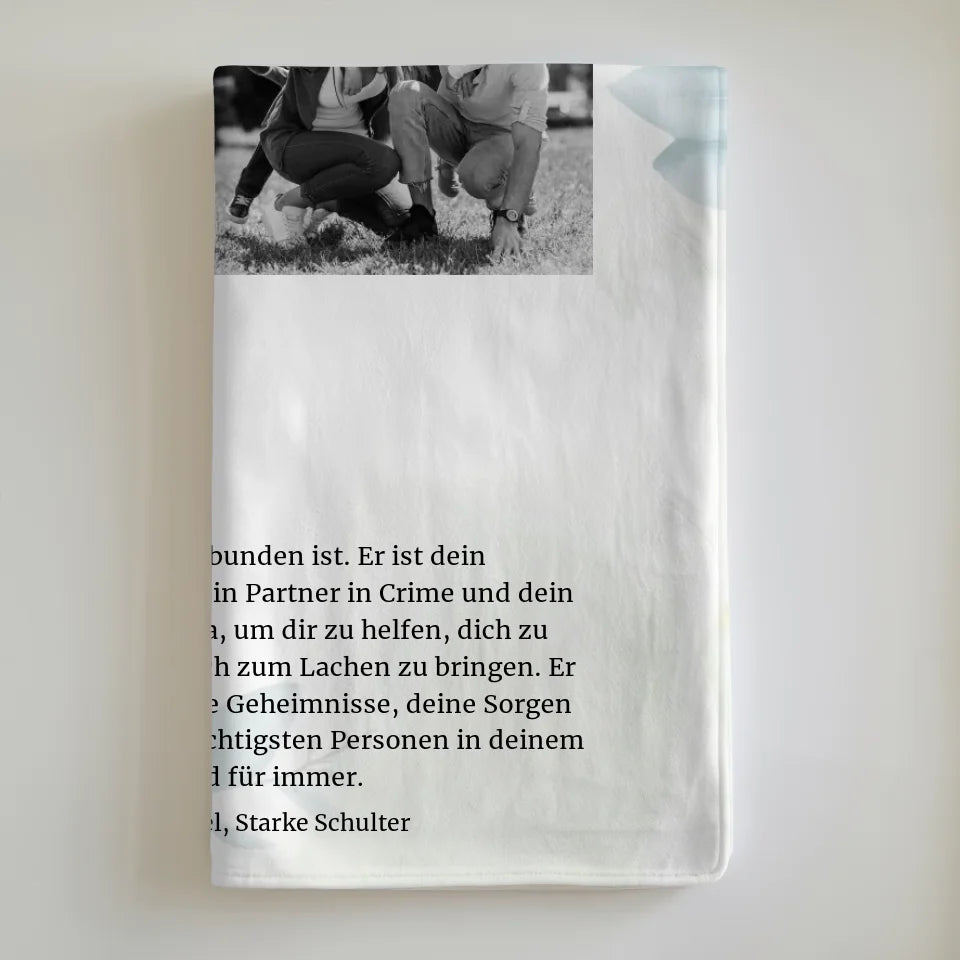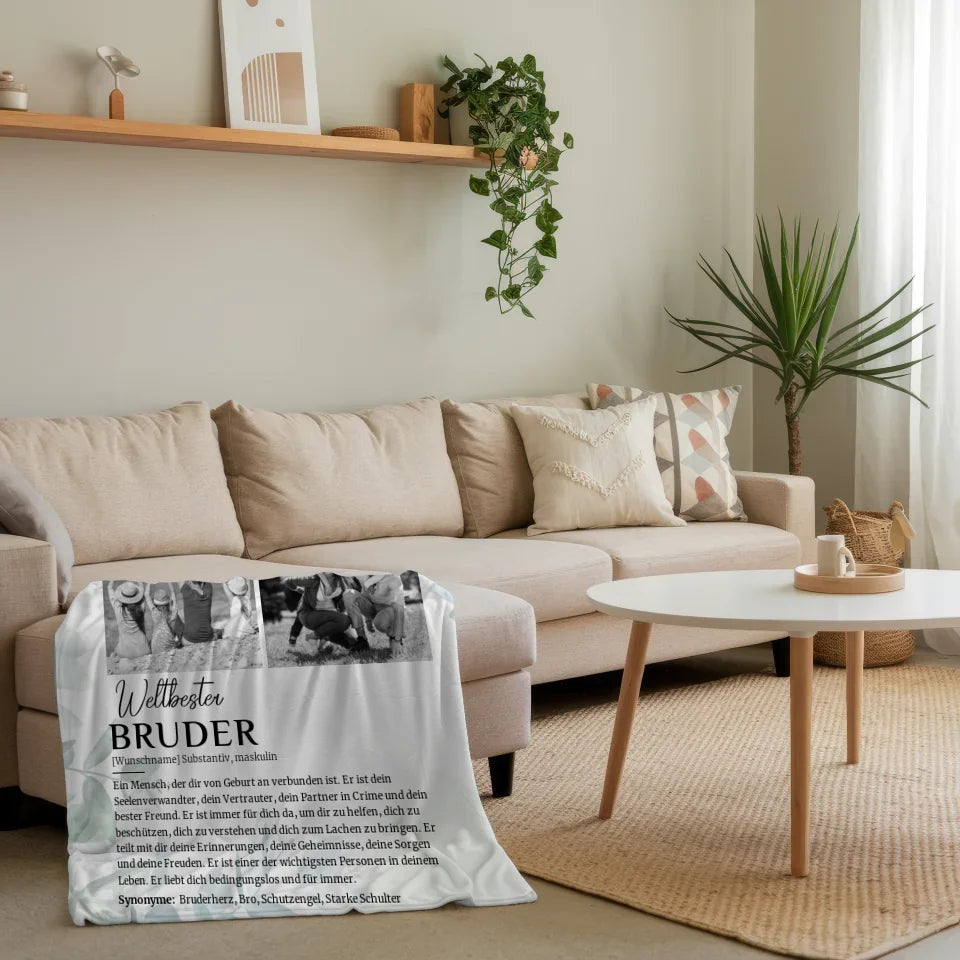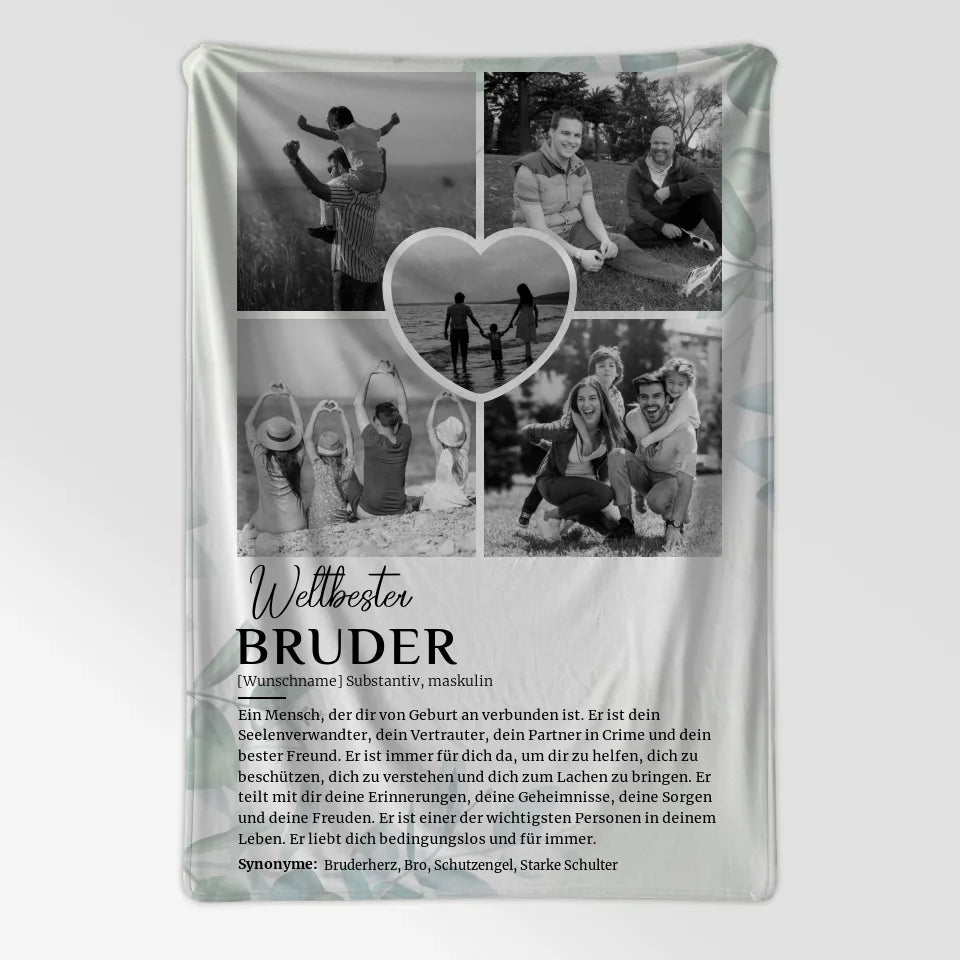 Die Definition Bruder umfasst nicht nur den Blutsverwandten, sondern auch den besten Freund, Vertrauten und Wegbegleiter. Verschenke ein Stück Heimat und Erinnerungen mit dieser einzigartigen Decke, die sowohl warmhält als auch Erinnerungen weckt. Personalisiere die Decke ganz nach deinen Wünschen und wähle dein Lieblingshintergrundbild, um das perfekte Geschenk zu kreieren, das von Herzen kommt.