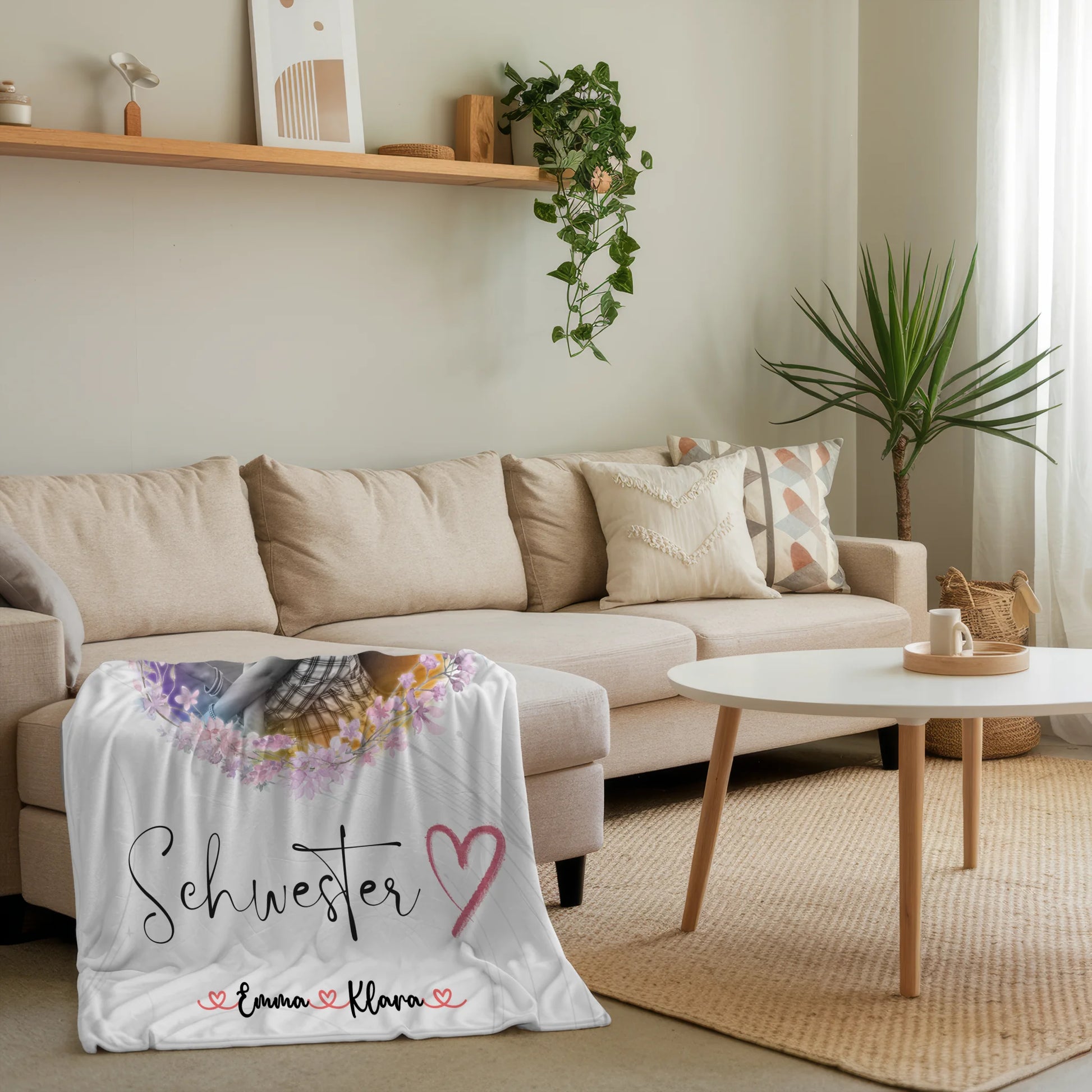 Personalisierte Decke Schwester mit 2 Fotos & Namen Black & White Schwesterherz