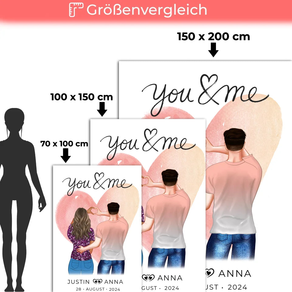 Überrasche deinen Partner oder deine Partnerin mit unserer einzigartigen personalisierten Decke You & Me für Paare. Dieses bezaubernde Geschenk bietet dir die Möglichkeit, zwei liebevolle Cliparts für Paare auszuwählen und diese mit euren Namen, dem Datum eures Kennenlernens sowie einem ganz persönlichen Spruch oder Wunschtext zu versehen. Die Kombination aus individuellen Figuren und dem romantischen Spruch "You & Me" macht diese Decke zu einem ganz besonderen Highlight für Verliebte.