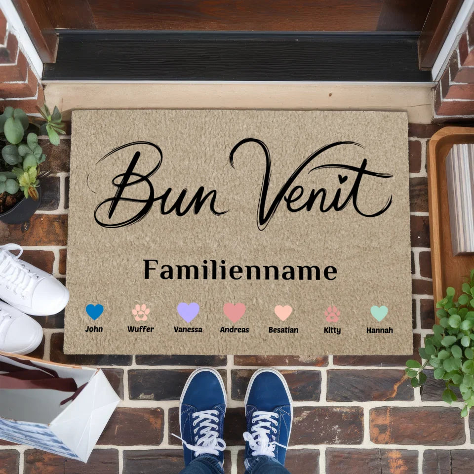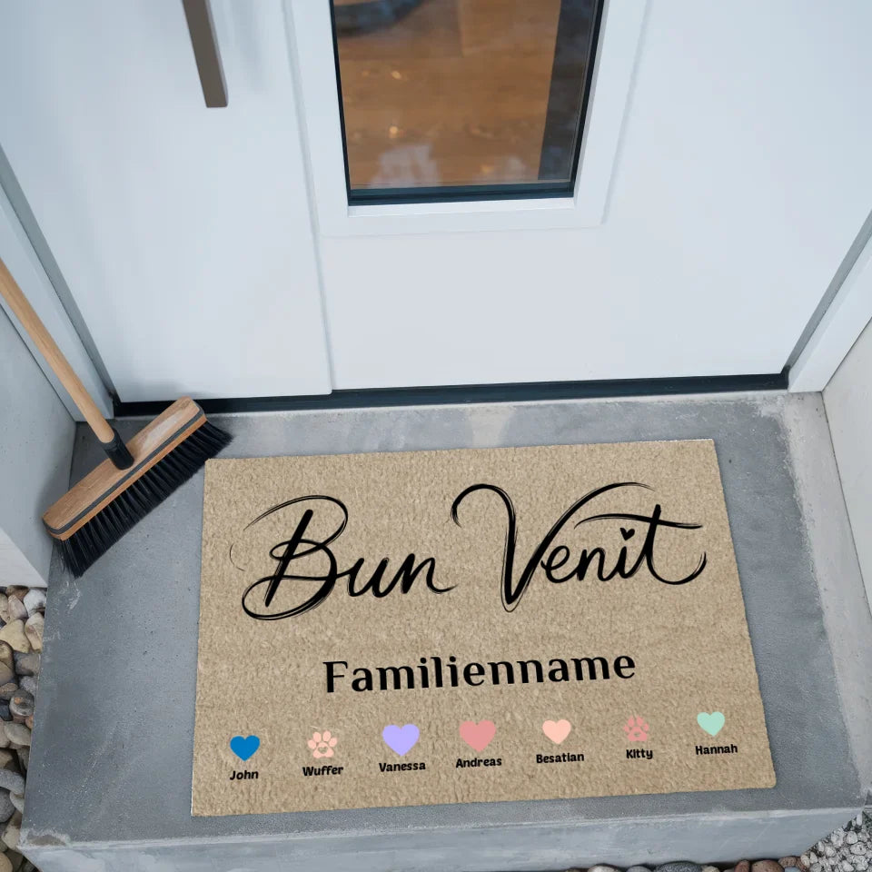 Personalisierte Familie Fußmatte Bun Venit mit Herzen für Dein Zuhause