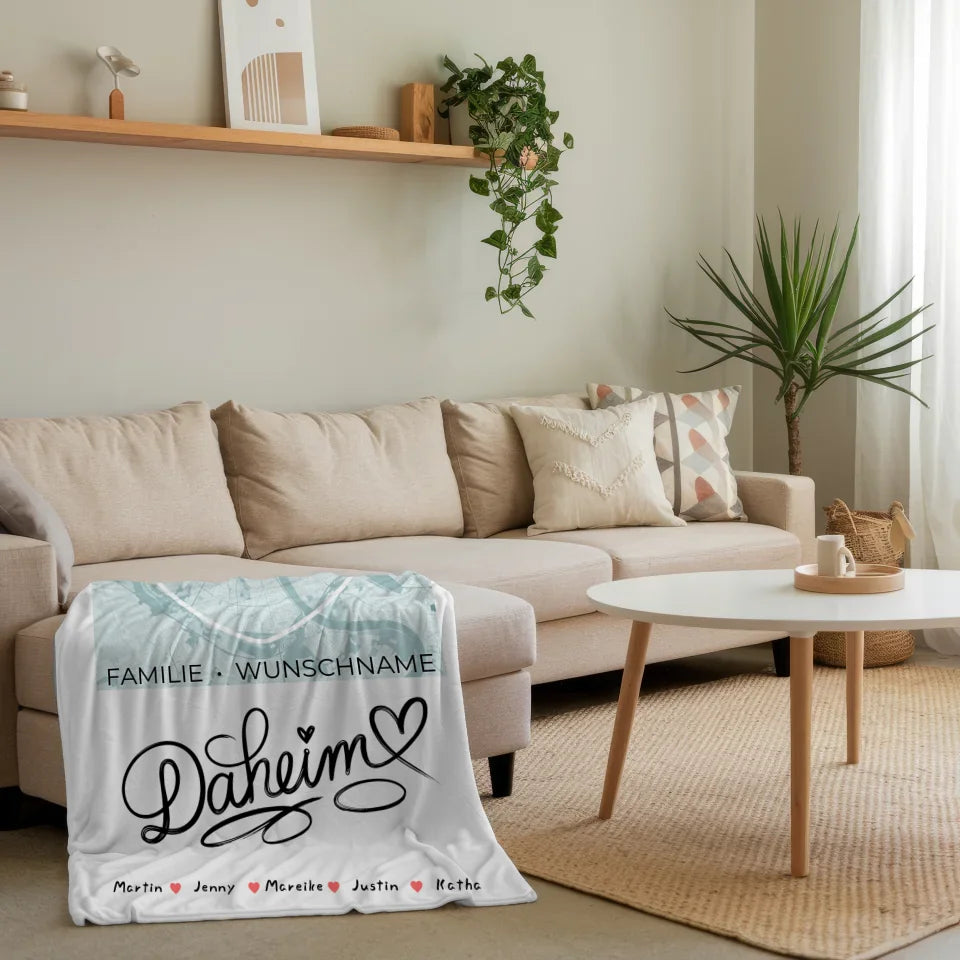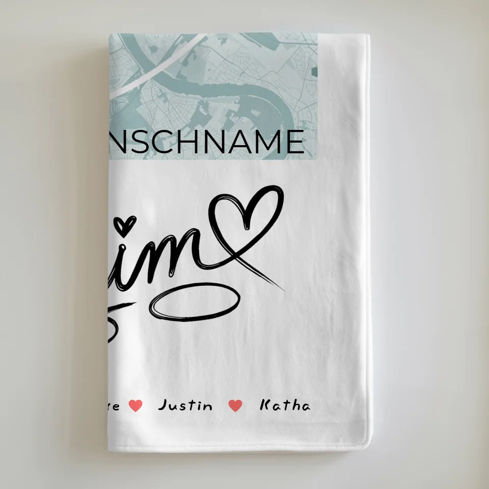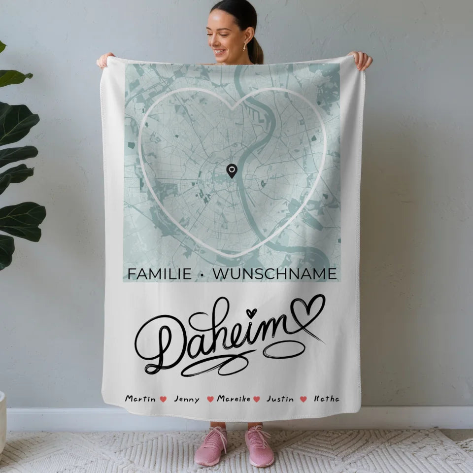 Entdecke die personalisierte Familien Decke mit Stadtkarte Daheim Herzform