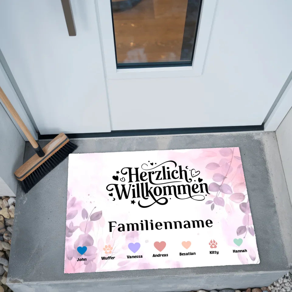 Personalisierte Familien Fußmatte Herzlich Willkommen mit Herzen Haustiere
