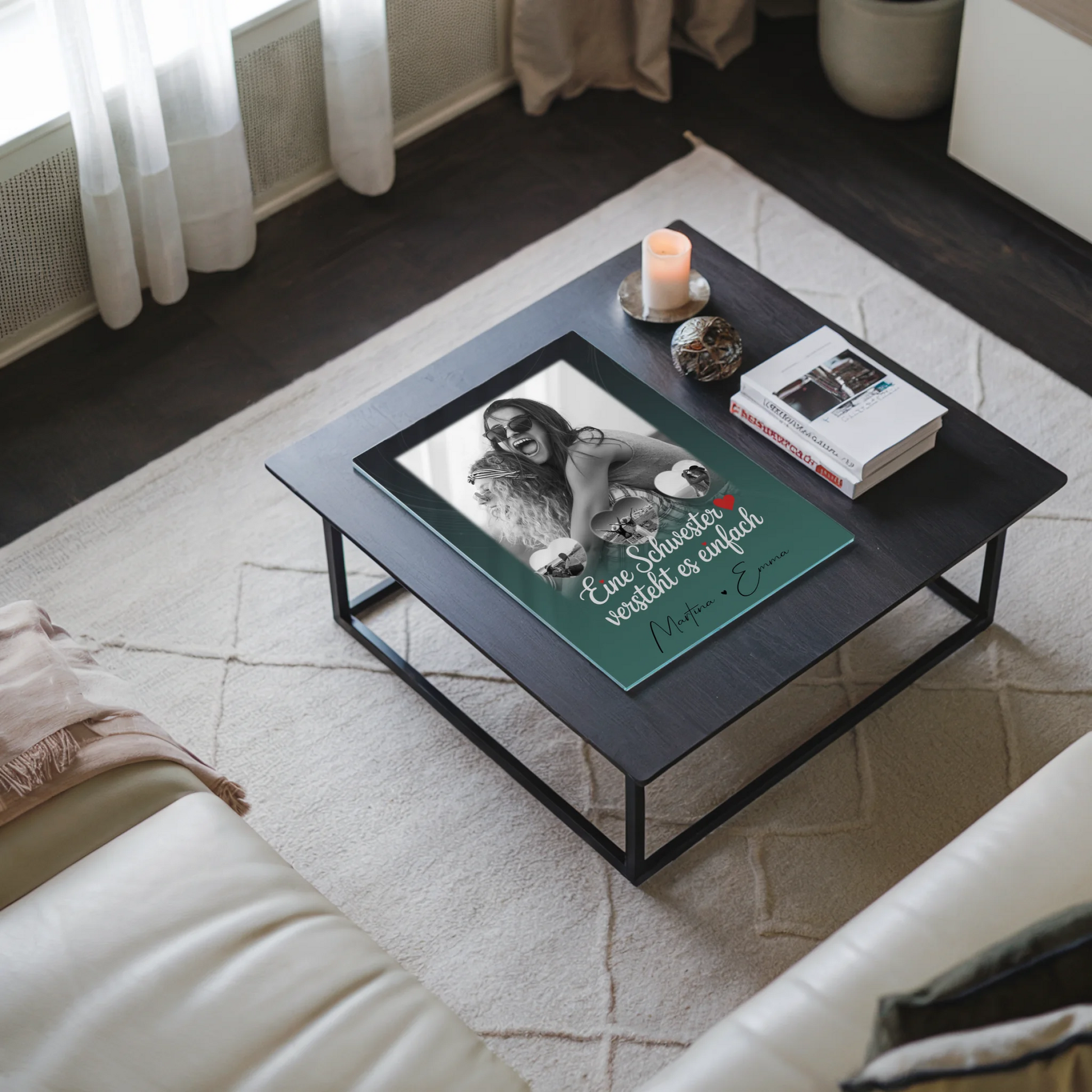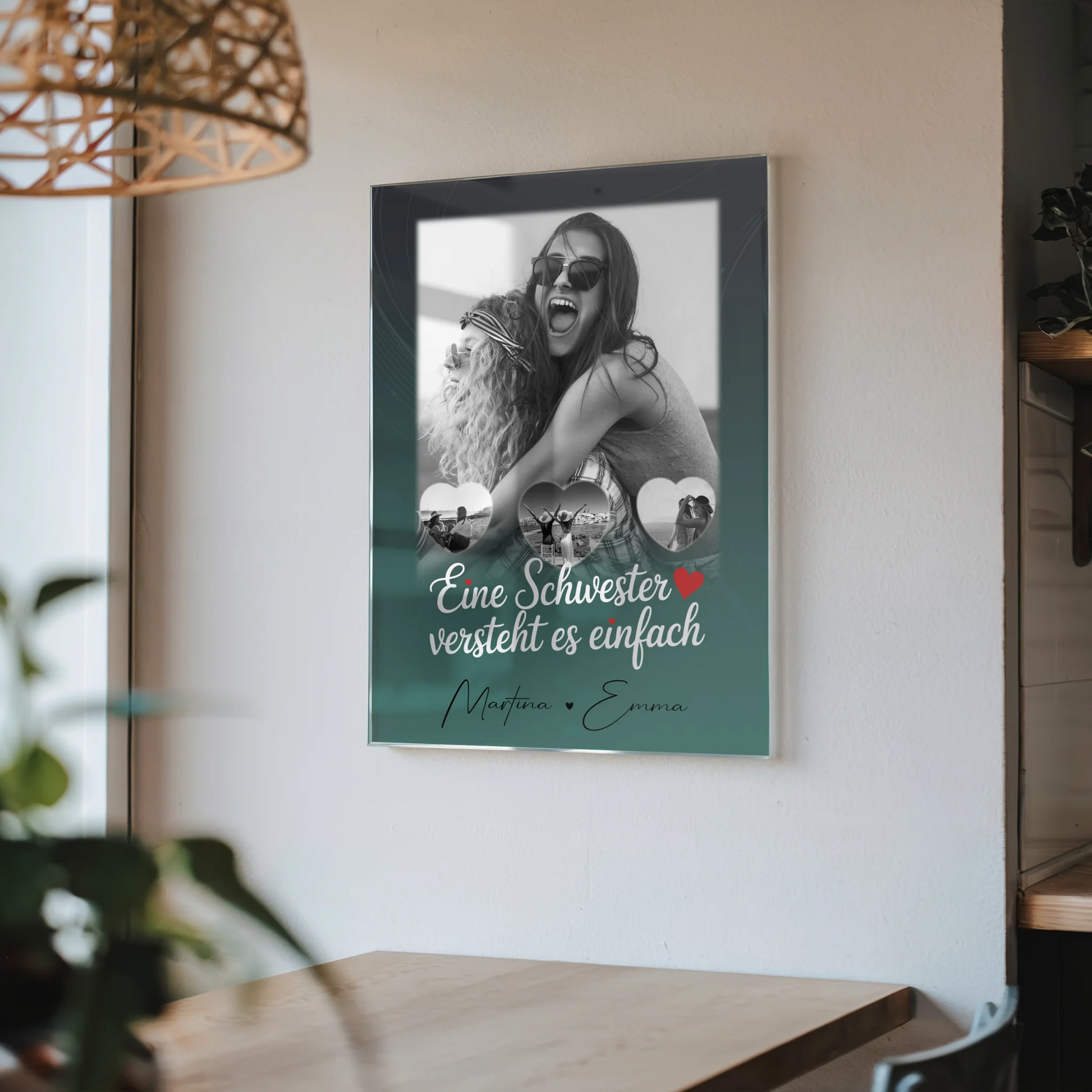 Überrasche deine Schwester mit einem ganz besonderen Geschenk: Das Personalisierte Foto Acrylglas mit 1 Foto und 3 kleine Herz Fotos für einzigartige Geschenke ist die perfekte Wahl, um deine Liebe und Wertschätzung auf eine kreative Weise zu zeigen. Dieses individuell gestaltbare Acrylglas kannst du ganz nach deinen Wünschen personalisieren, indem du bis zu 4 Fotos, einen eigenen Spruch oder Wunschtext sowie die Namen eingibst. Das Ergebnis ist ein einzigartiges Dekorationsstück, das garantiert für Freude sorgt. Ob zum Geburtstag deiner Schwester oder als liebevolle Überraschung – dieses personalisierte Acrylglas ist ein unvergessliches Geschenk. Es eignet sich ideal für alle, die persönliche und emotionale Geschenke schätzen. Gestalte jetzt dein individuelles Acrylglas und mache den besonderen Tag deiner Schwester noch unvergesslicher!