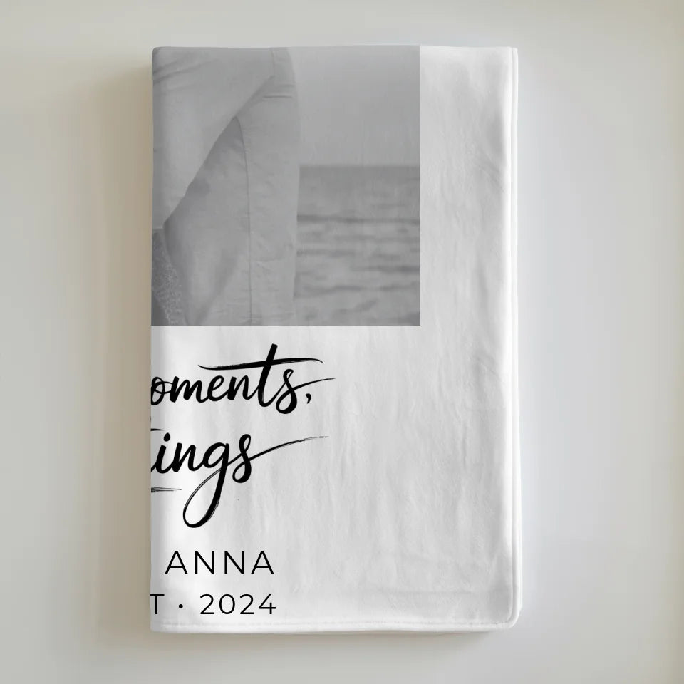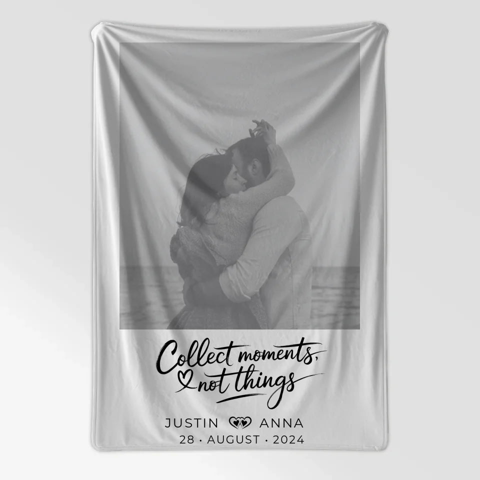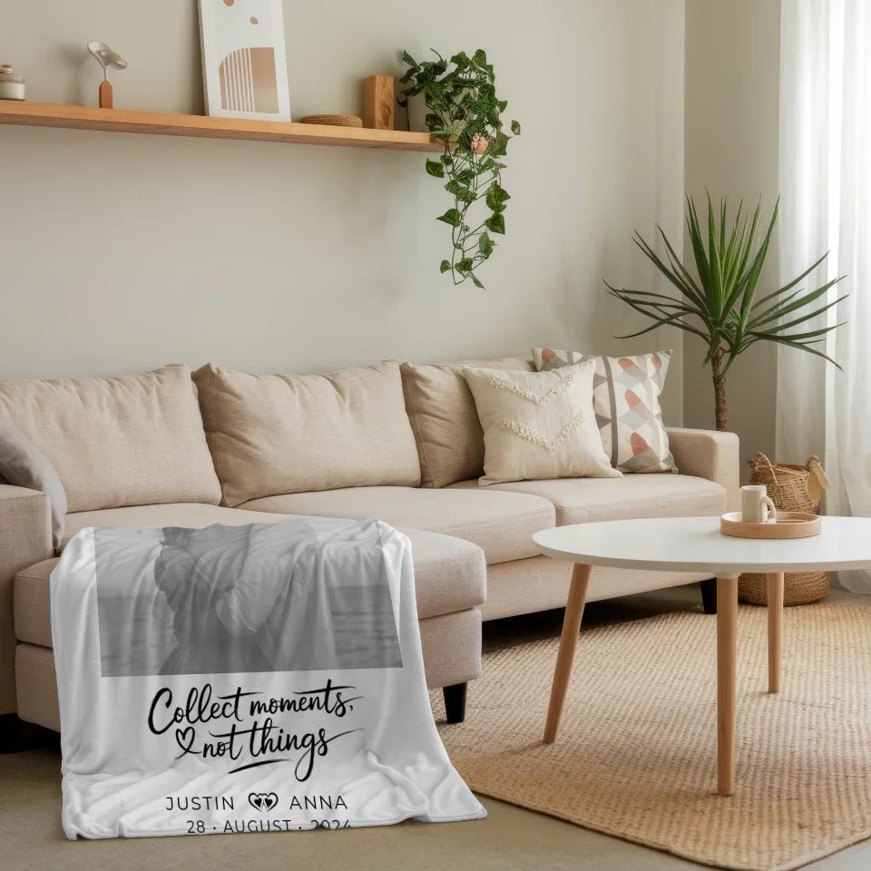 Die personalisierte Foto Decke bietet dir die Möglichkeit, dein Lieblingsfoto, einen eigenen Spruch oder Wunschtext sowie die Namen und das Datum deiner Wahl einzufügen. Dadurch wird jede Decke zu einem persönlichen Unikat, das die schönsten Erinnerungen festhält. Der inspirierende Spruch 'Collect Moments Not Things' auf dem Design erinnert dich und dein Partner Pärchen daran, die gemeinsamen Erlebnisse zu schätzen.