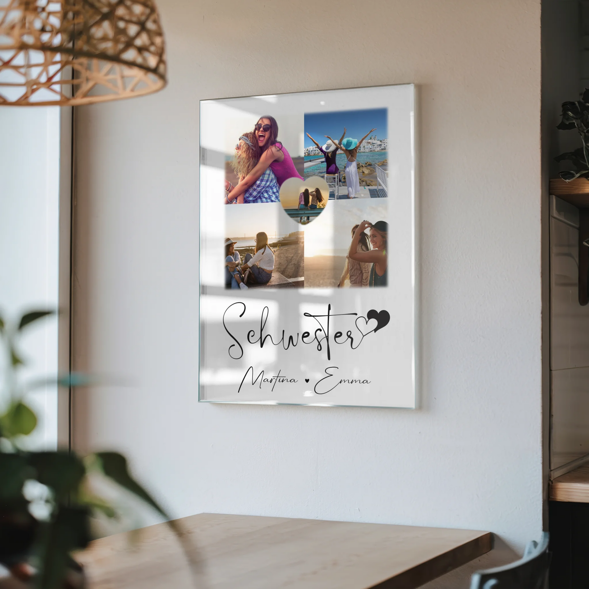 Überrasche deine Schwester mit einem ganz besonderen Geschenk – dem Personalisierte Foto Mit Acrylglas mit 4 Fotos und 1 Herz Foto für einzigartige Geschenke. Dieses individuelle Kunstwerk ist perfekt, um gemeinsame Erinnerungen stilvoll und langlebig zu präsentieren. Du kannst dieses einzigartige Geschenk ganz nach deinen Wünschen gestalten, indem du bis zu 5 Fotos, einen eigenen Spruch oder Wunschtext sowie die Namen deiner Schwester personalisierst. Das hochwertige Acrylglas sorgt für eine brillante Optik und macht dein Geschenk zu einem echten Blickfang. Ob zum Geburtstag oder einem anderen besonderen Anlass – dieses personalisierte Acrylglas ist das ideale Präsent, um deine Liebe und Wertschätzung zu zeigen. Schenke deiner Schwester ein einzigartiges Erinnerungsstück, das sie immer an schöne Momente erinnert und garantiert für Begeisterung sorgt. Bestelle jetzt dein individuelles Personalisierte Foto Mit Acrylglas mit 4 Fotos und 1 Herz Foto für einzigartige Geschenke und mache den Geburtstag deiner Schwester unvergesslich!