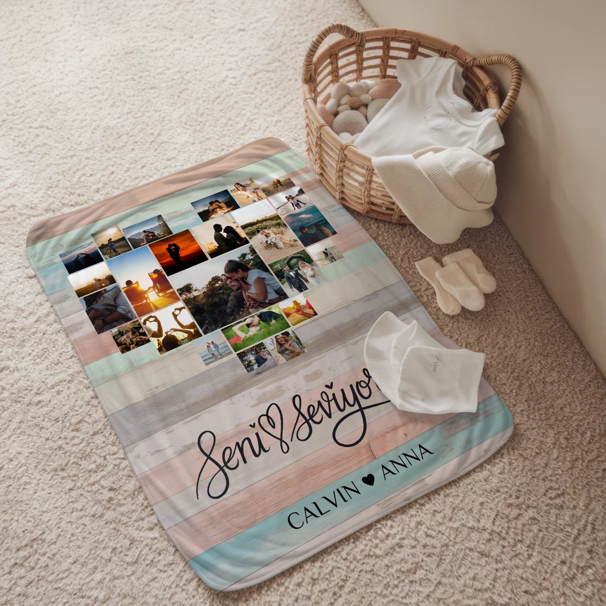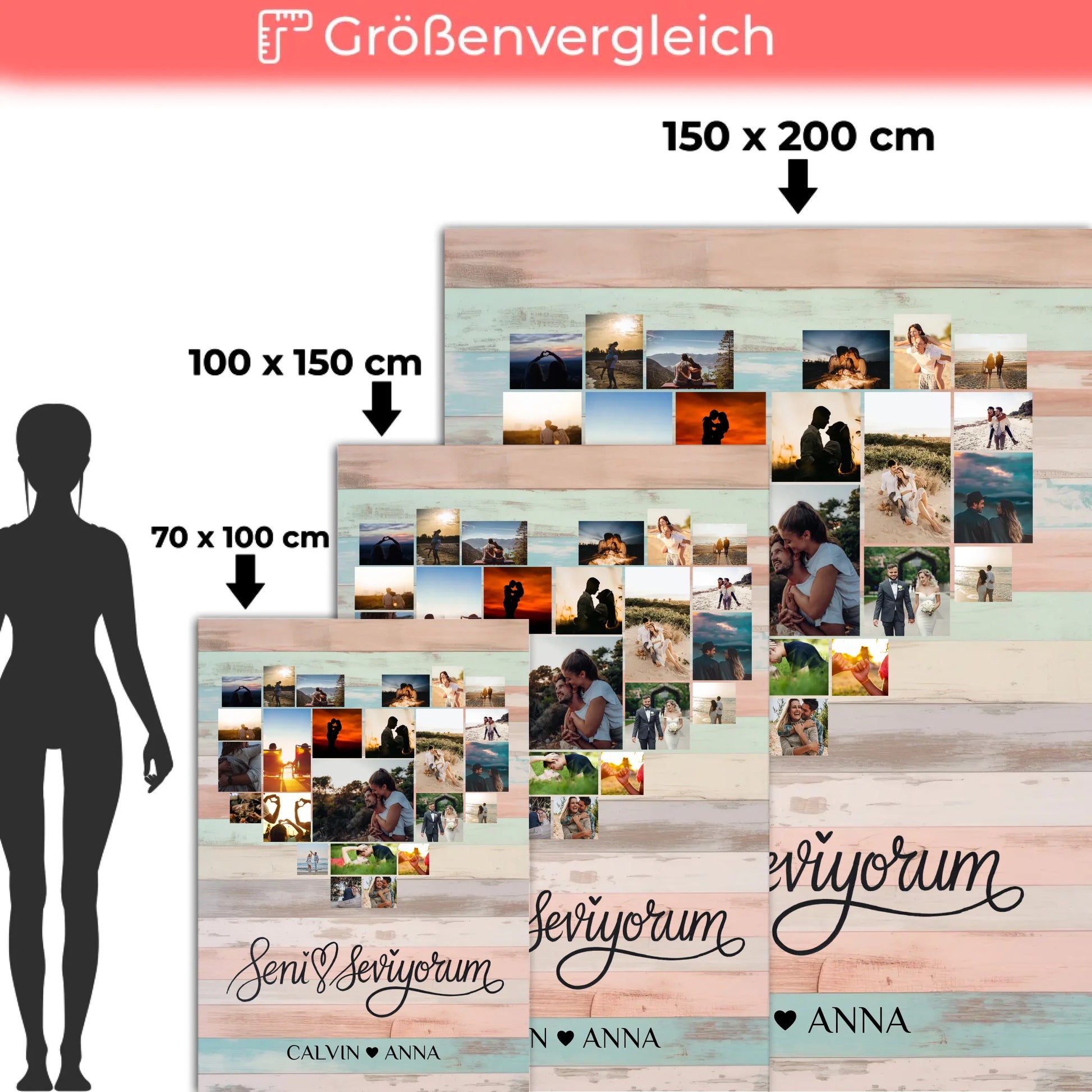 Mache dein Geschenk einzigartig und zeige deine Liebe auf eine kreative Art mit unserer Personalisierte Fotocollage Decke Seni Seviyorum für Paare.