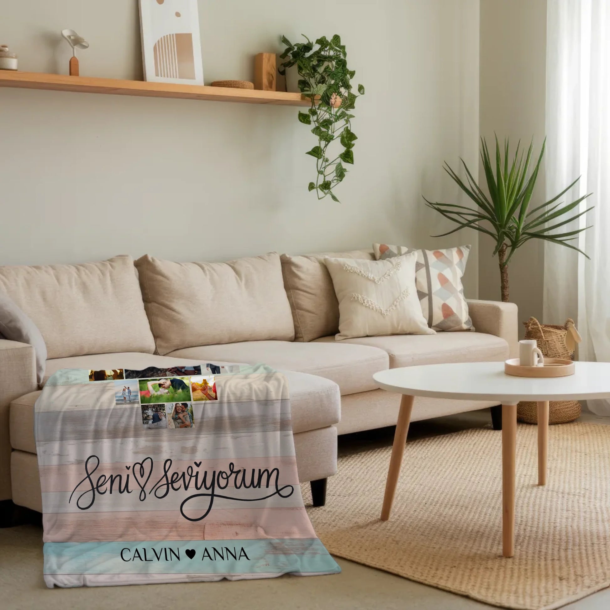Personalisierte Fotocollage Decke Seni Seviyorum für Paare