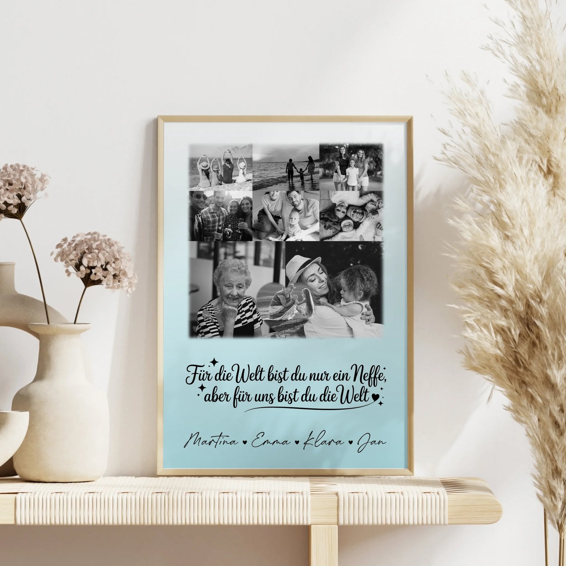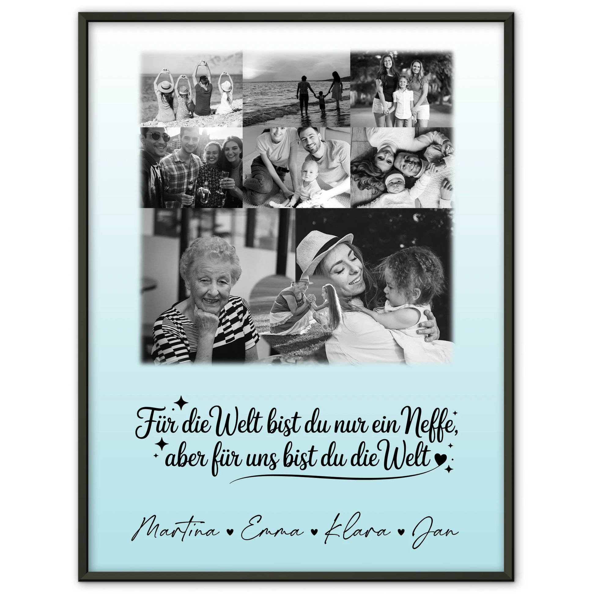 Entdecke das perfekte Geschenk für jeden Anlass mit unserer einzigartigen Personalisierte Fotocollage Großes Bild aus Vielen Kleinen mit 8 Fotos und Herzmotiv Du bist für mich die Welt Schwarz-Weiß. Diese liebevoll gestaltete Collage vereint deine schönsten Erinnerungen in einem beeindruckenden Design und ist ideal für Neffen, die dir besonders am Herzen liegen. Du kannst dieses besondere Geschenk ganz individuell anpassen, indem du bis zu 9 Fotos hochlädst, einen eigenen Spruch oder Wunschtext sowie Namen hinzufügst. Das Design trägt den emotionalen Spruch: „Für die Welt bist du nur eine Patentante aber für mich bist du die Welt“, was es zu einem unvergesslichen Präsent macht. Ob Geburtstag, Weihnachten, oder einfach so – dieses personalisierte Poster ist für Neffe und alle, die du liebst, perfekt geeignet. Überrasche deine Familie und Freunde mit einem einzigartigen, liebevoll gestalteten Geschenk, das ihre Herzen berührt und für immer in Erinnerung bleibt. Bestelle jetzt deine Fotocollage für Neffe und zeige deine Wertschätzung auf eine ganz besondere Weise!