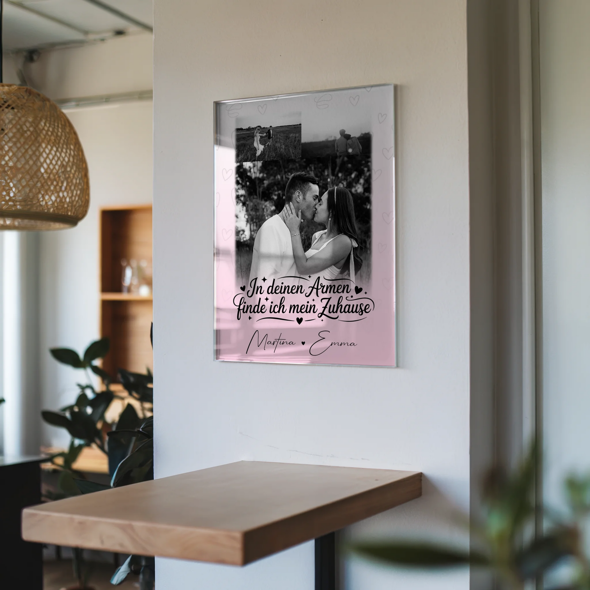 Überrasche deinen Partner oder deine Partnerin mit einem einzigartigen und emotionalen Geschenk – unserem Produkt Personalisierte Fotogeschenke mit 3 Fotos in deinen Armen auf Acrylglas Poster Leinwand Tasse. Dieses besondere Präsent kannst du individuell gestalten, indem du 3 Fotos, einen eigenen Spruch oder Wunschtext sowie die Namen der Empfänger hinzufügst. Das Design ist mit dem schönen Spruch In deinen Armen finde ich mein Zuhause versehen und eignet sich perfekt für den Valentinstag. Zeige deinem Partner, wie viel er oder sie dir bedeutet, indem du eure schönsten Momente in einem hochwertigen, personalisierten Geschenk vereinst. Ob als Poster, Leinwand, Tasse oder Kissen – dieses Geschenk ist ideal für Paare, die ihre Liebe auf besondere Weise zum Ausdruck bringen möchten. Mache den Valentinstag unvergesslich mit einem individuellen Fotogeschenk, das eure gemeinsame Geschichte erzählt und immer wieder Freude bereitet.