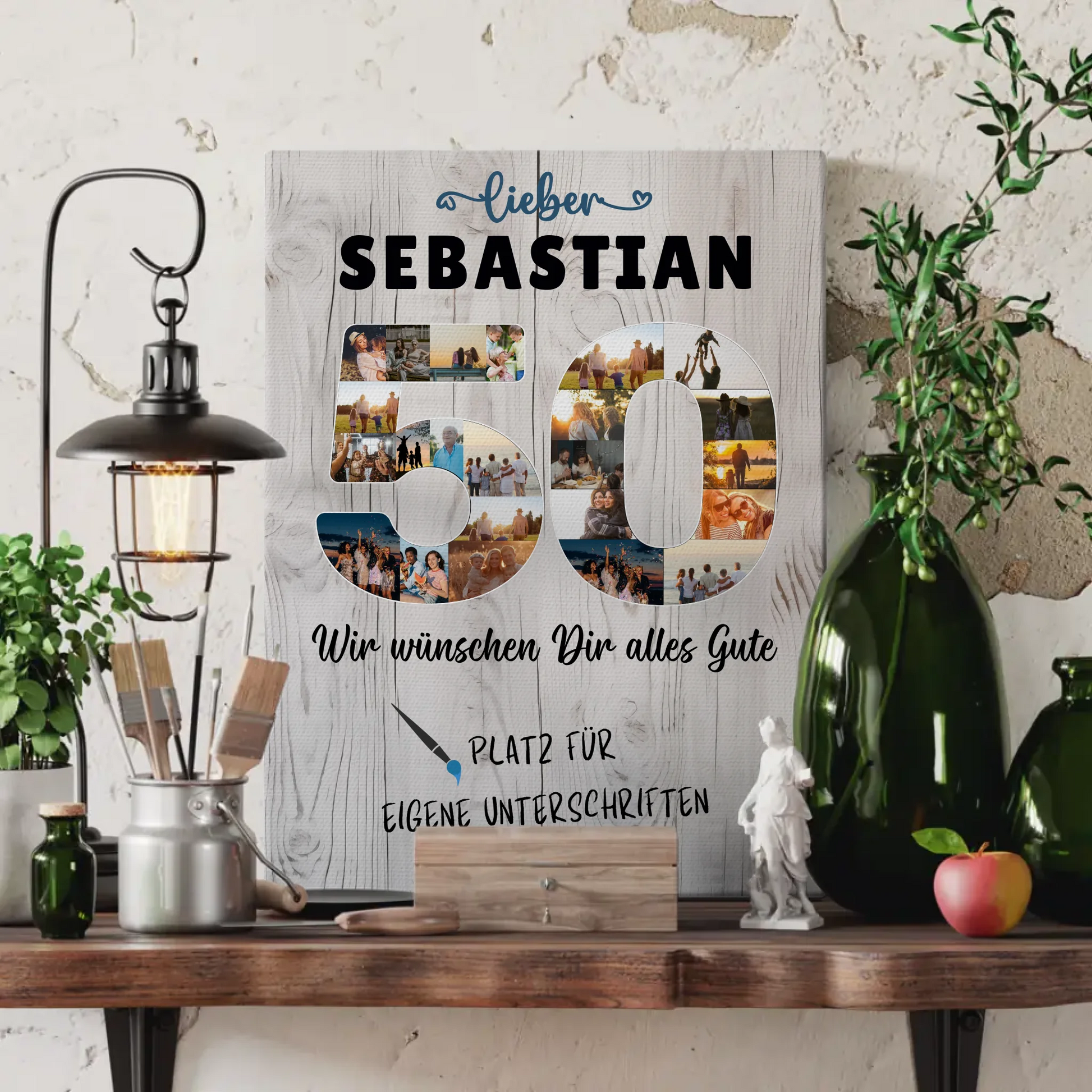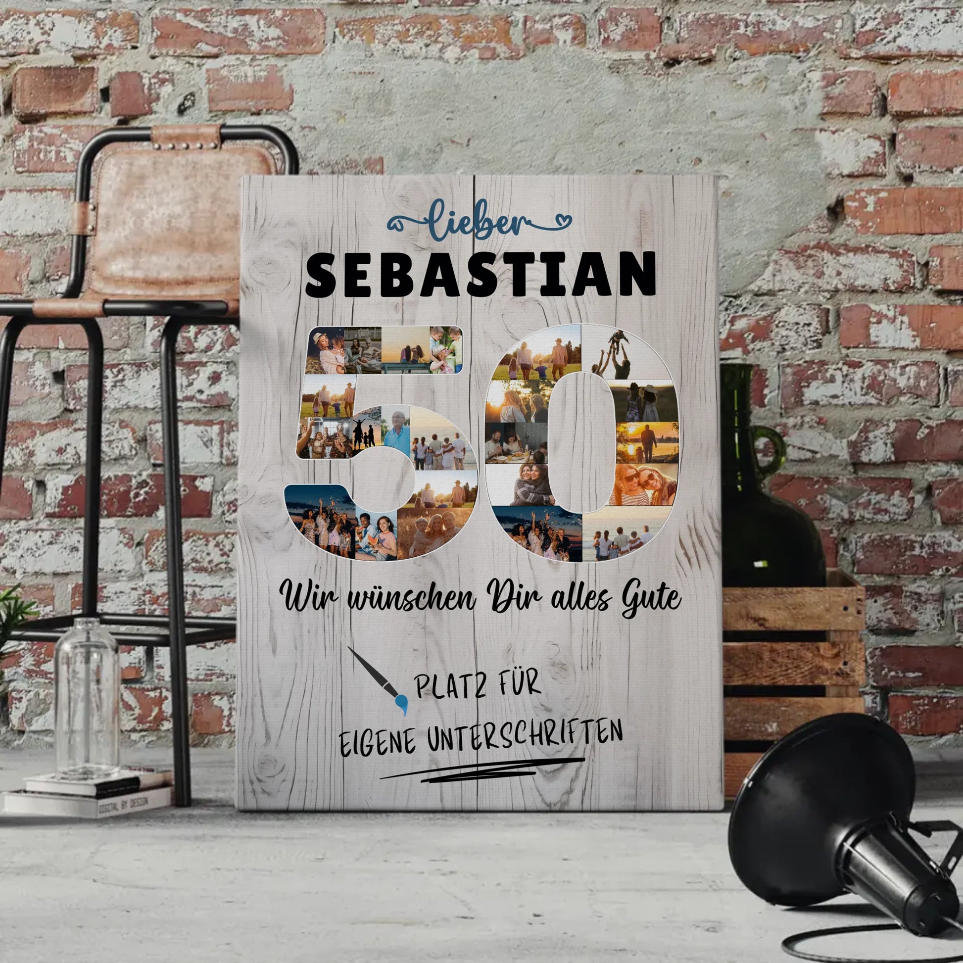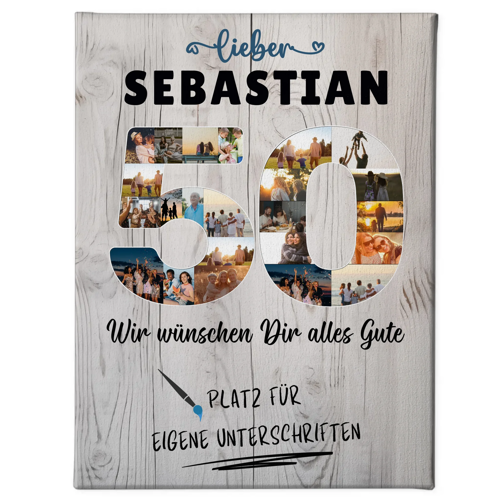 Feiere den 50. Geburtstag deines Paps oder Bruders mit einer einzigartigen, personalisierte Fotoleinwand, die voller bedeutungsvoller Erinnerungen steckt! Diese individuelle Leinwand ist nicht nur ein tolles Geschenk, sondern auch ein echtes Kunstwerk für das Zuhause. Personalisiere die Fotoleinwand mit über 20+ Fotos, einem eigenen Spruch oder Wunschtext, Namen oder sogar eigenen Unterschriften. So wird jede Leinwand zu einem ganz persönlichen Kunstwerk, das die Herzen berührt.
