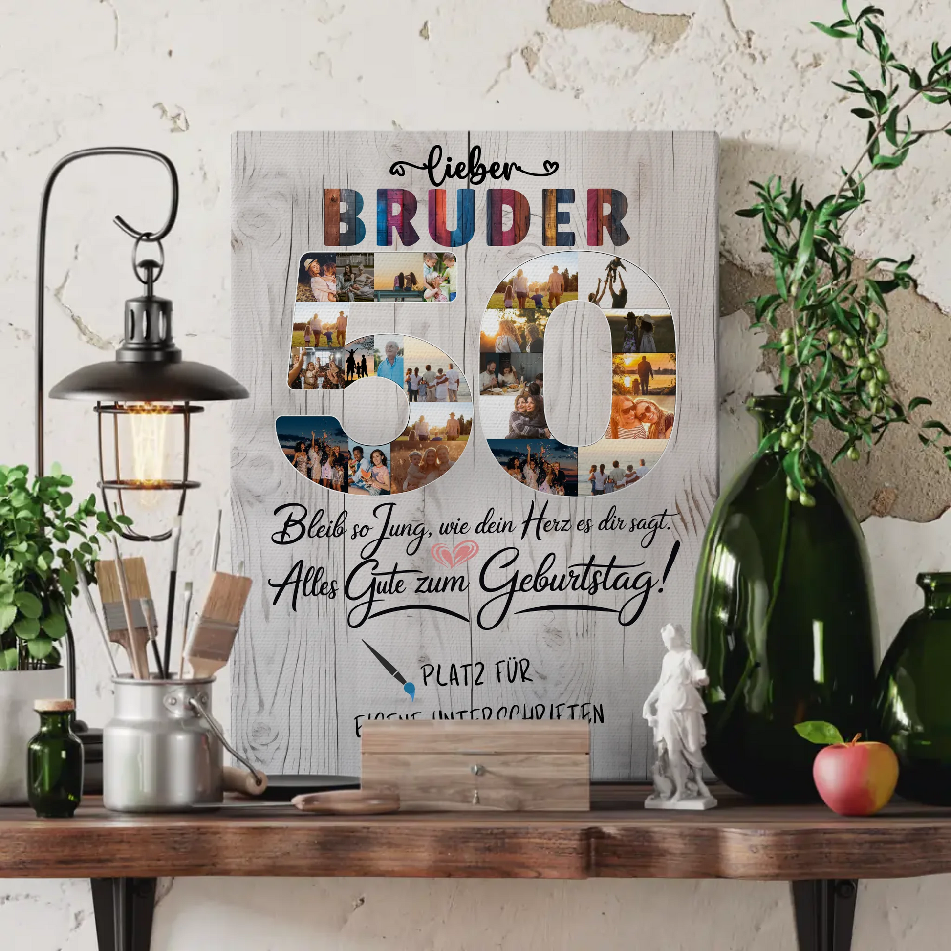 Bestelle jetzt deine persönliche personalisierte Fotoleinwand, um ein unvergessliches Geburtstagsgeschenk zu kreieren! Mache den 50. Geburtstag deines Bruders zu einem unvergesslichen Erlebnis!