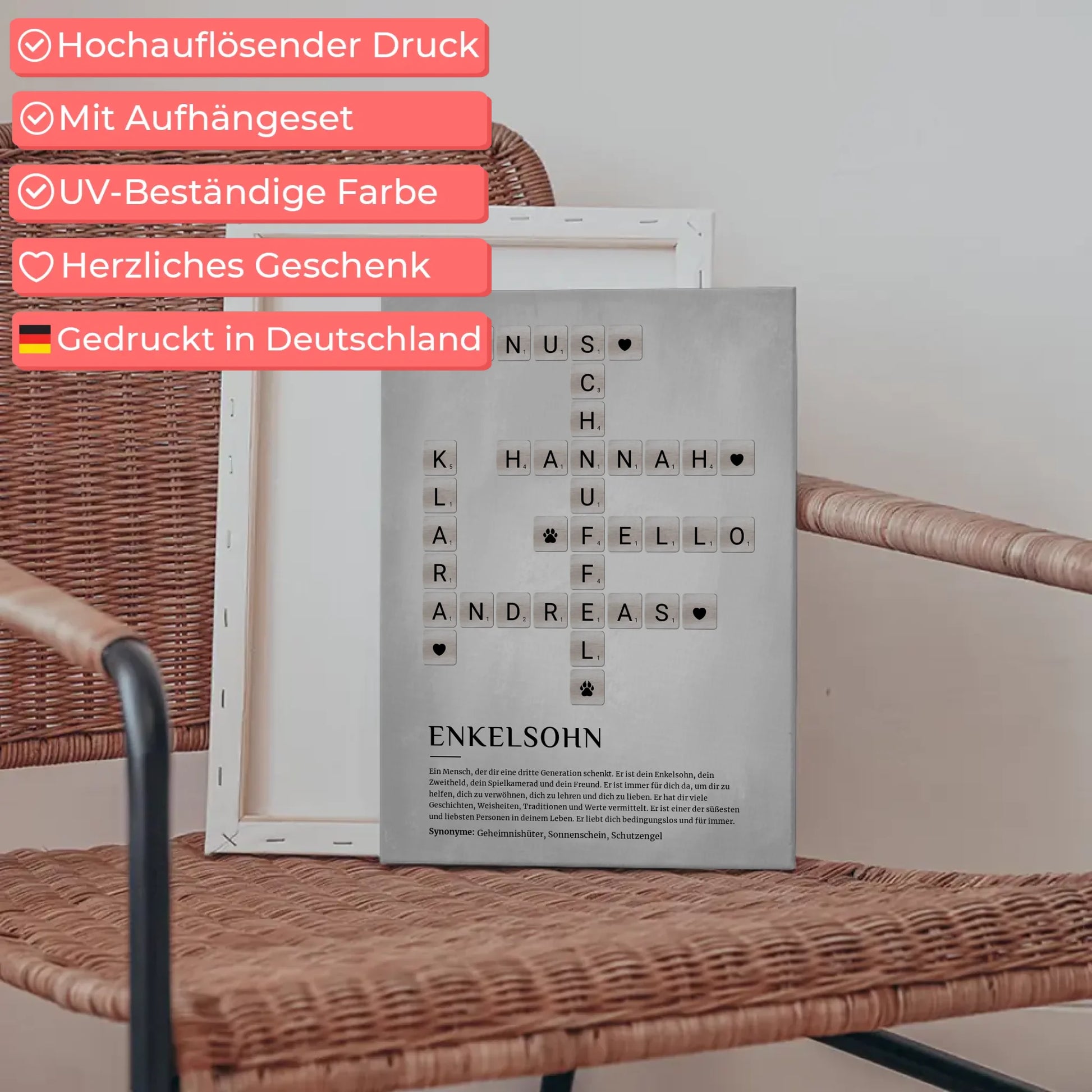 Mit unserem kreativen Kreuzworträtsel-Design und den Buchstaben auf Steinchen wird dieses Geschenk zu einem echten Hingucker. Überrasche deinen Enkelsohn mit diesem besonderen Kunstwerk und schaffe Erinnerungen, die ein Leben lang halten. Bestelle jetzt deine personalisierte Fotoleinwand und mache dein Geschenk unvergesslich!