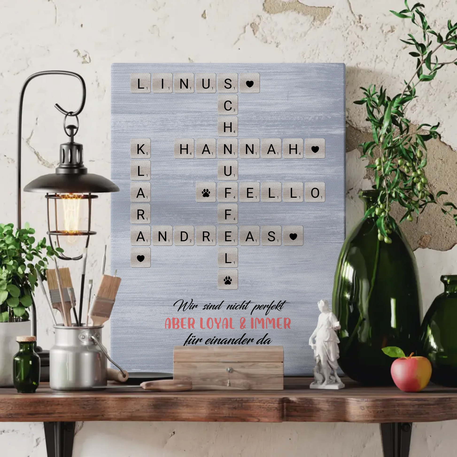 Egal ob zum Geburtstag, Jubiläum oder einfach nur so – diese Kreuzworträtsel mit Namen sind geeignet für jeden Anlass. Verleihe deinem Geschenk eine persönliche Note und kombiniere die Namen im beliebten Scrabble Design! Auch tierische Familienmitglieder wie dein Hund können hier ihren Platz finden – entdecke unsere personalisierte Leinwand Familie Mit Hund, um die gesamte Familie abzulichten.