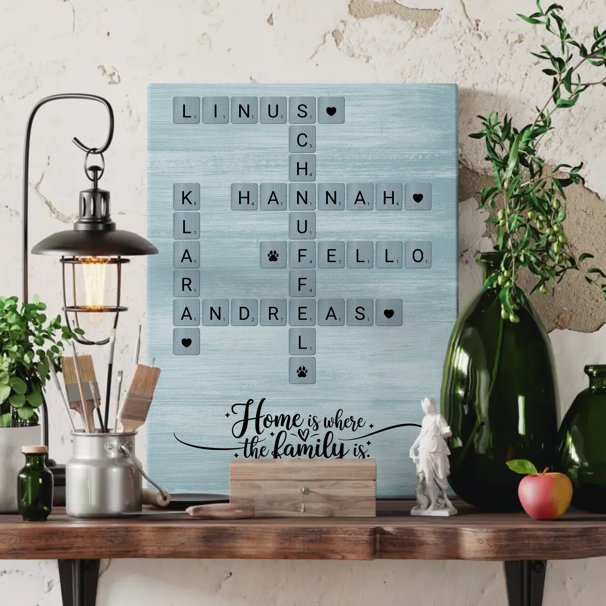 Personalisierte Fotoleinwand Home is where the family is Kreuzworträtsel mit Namen Wunschtext