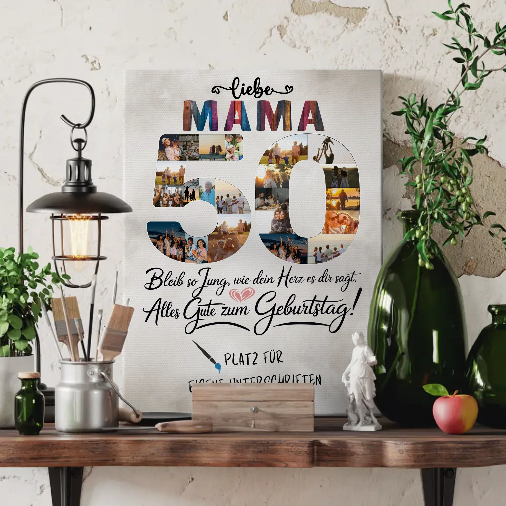 Möchtest du deiner Mama zum 50. Geburtstag ein ganz besonderes Geschenk machen? Unsere personalisierte Fotoleinwand, die du mit Unterschriften sowie individuellen Texten gestalten kannst, ist die perfekte Wahl! Kreiere ein einzigartiges Kunstwerk, das ihre schönsten Erinnerungen in Form von über 20+ Fotos vereint. Lass deiner Kreativität freien Lauf und füge einen eigenen Spruch oder Wunschtext hinzu, um es noch persönlicher zu machen.