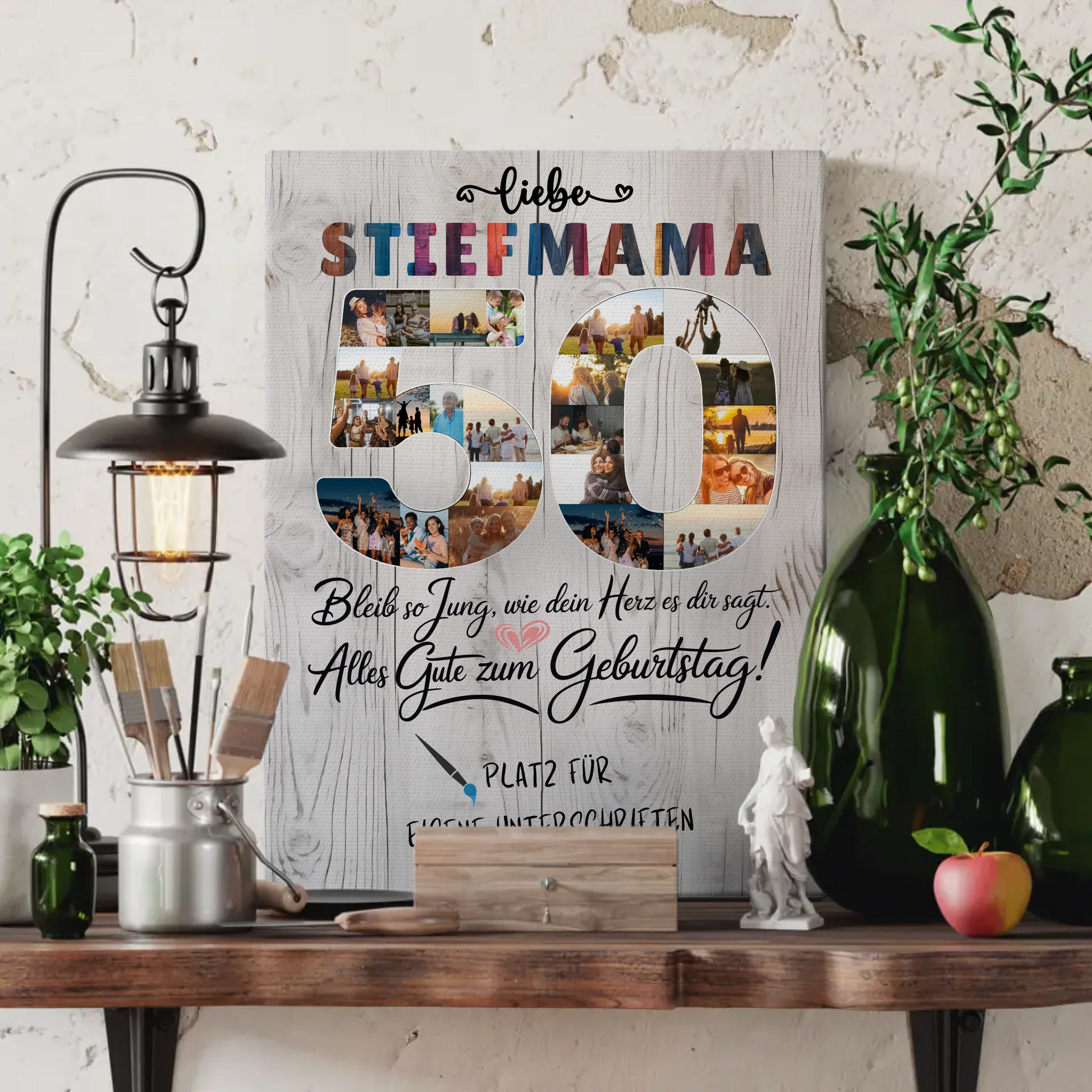 Personalisierte Fotoleinwand mit Unterschriften Stiefmama 50 Geburtstag Fotos Bleib Jung
