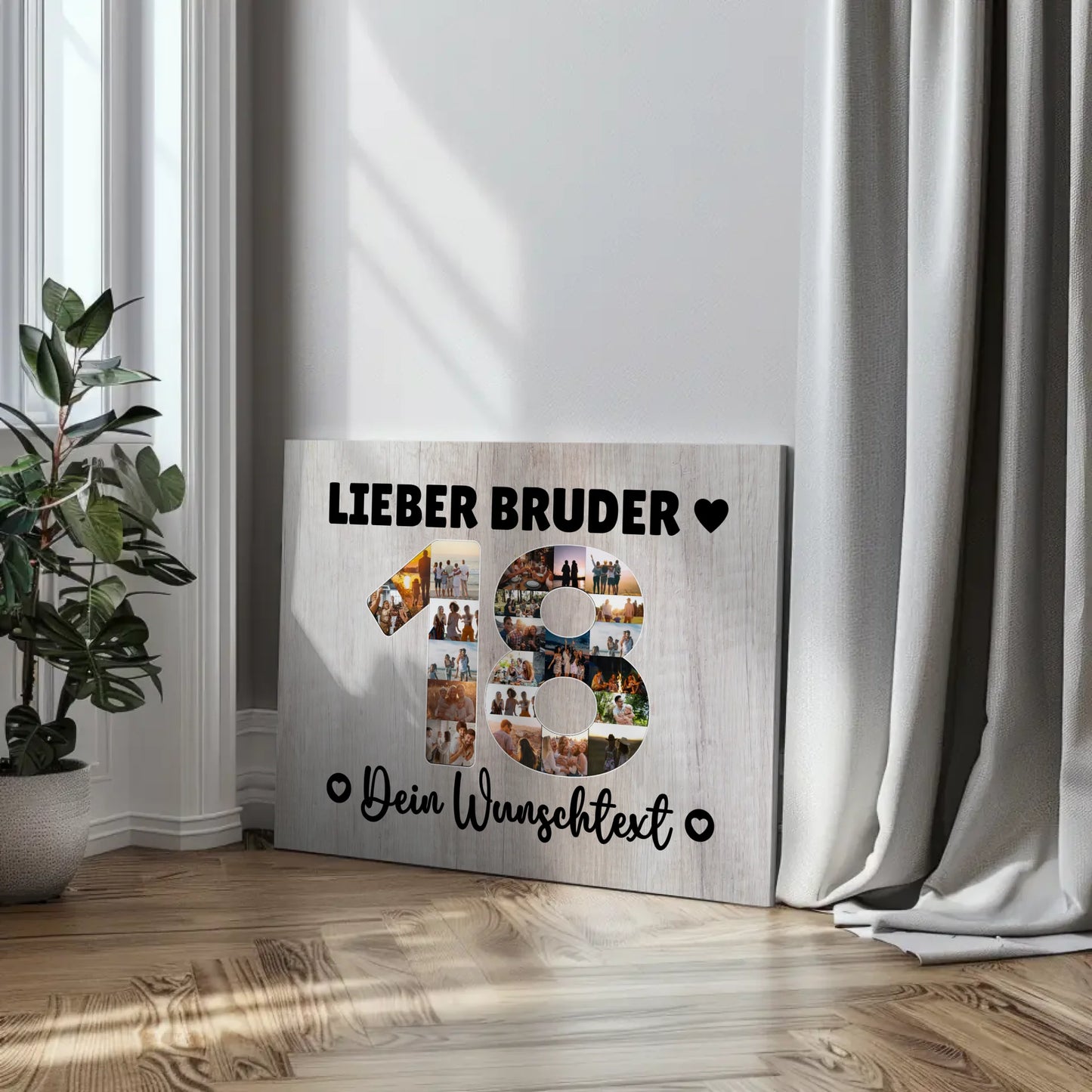 Schenke deinem Bruder das perfekte Geschenk zum 18. Geburtstag mit einer einzigartigen, personalisierten Fotoleinwand! Diese individuelle Leinwand ist nicht nur ein großartiges Dekorationsstück, sondern auch eine bleibende Erinnerung an einen besonderen Tag. Du kannst den Namen deines Bruders, einen eigenen Spruch oder Wunschtext sowie ein Hintergrundbild deiner Wahl wählen, um die Fotoleinwand ganz nach seinen Vorstellungen zu gestalten.