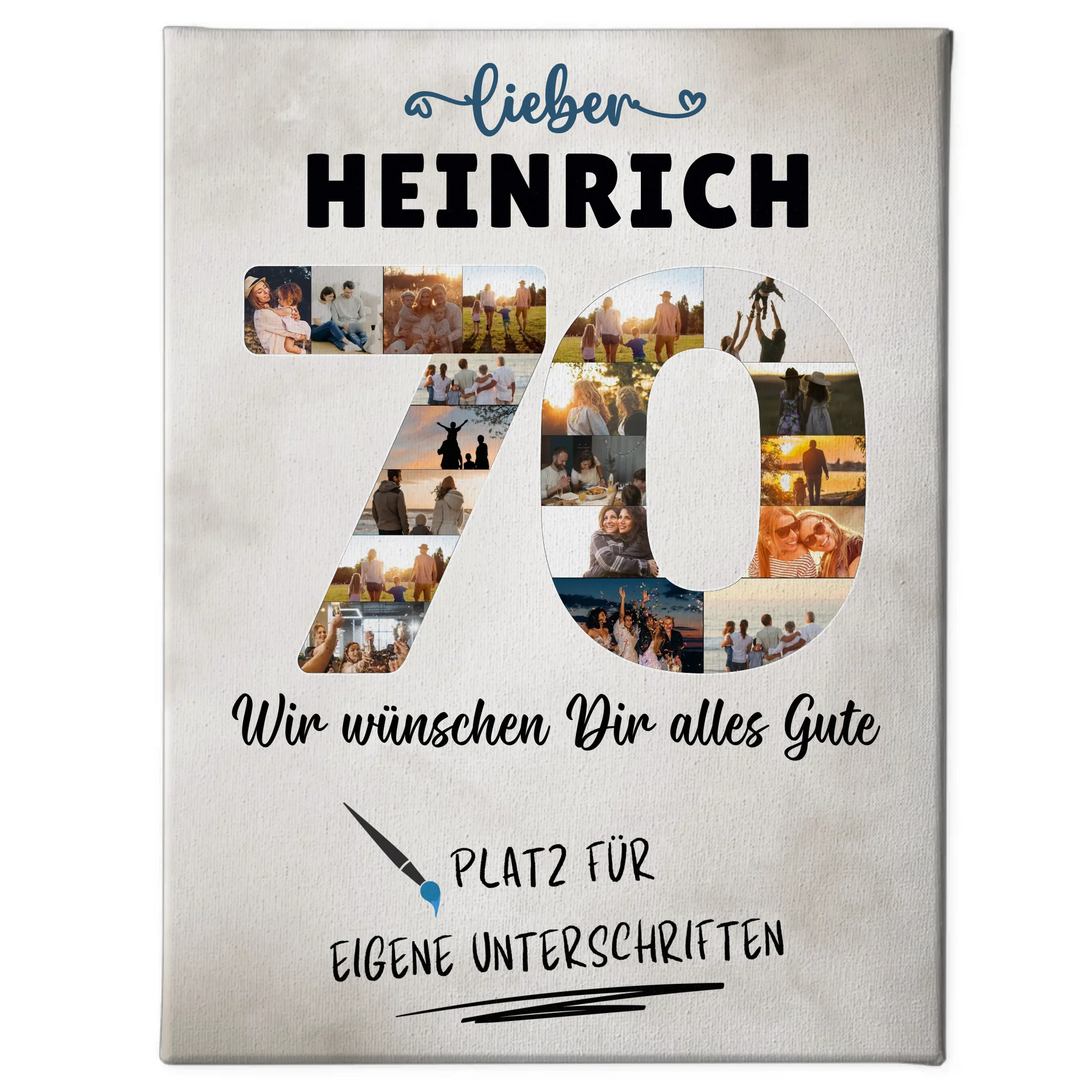 Mache den 70. Geburtstag für Opa oder Papa unvergesslich mit unserer einzigartigen personalisierte Fotoleinwand mit Wunschtext. Dieses besondere Geschenk ist nicht nur ein dekoratives Highlight, sondern auch eine tolle Möglichkeit, Deine wertvollsten Erinnerungen festzuhalten.