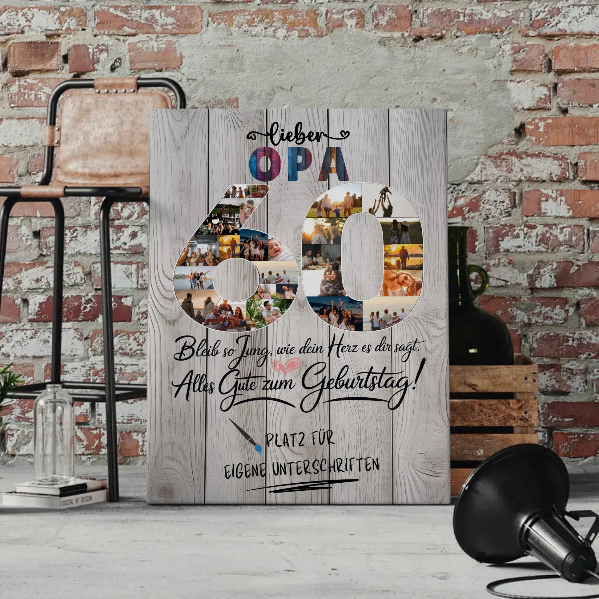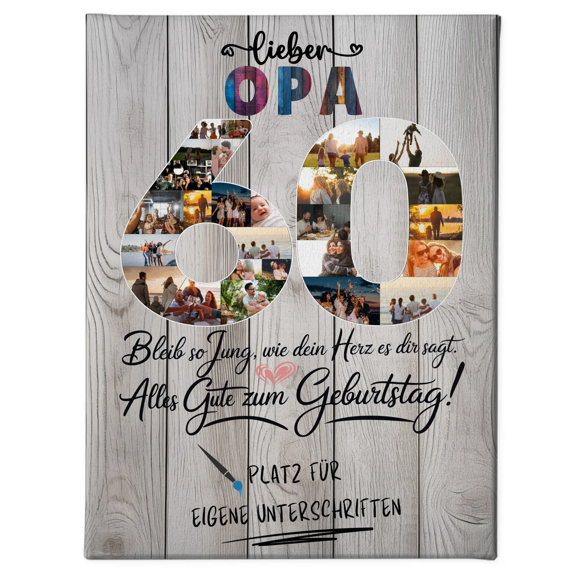 Überrasche Deinen Opa zum 60. Geburtstag mit einer einzigartigen und personalisierte Fotoleinwand, die seine besten Erinnerungen verewigt! Diese besondere Leinwand bietet die Möglichkeit, über 20+ Fotos auszuwählen, die liebevoll in ein kreatives Design integriert werden können. Ergänze das Kunstwerk mit Deinem eigenen Spruch oder Wunschtext sowie Namen oder individuellen Unterschriften von Freunden und Familie.