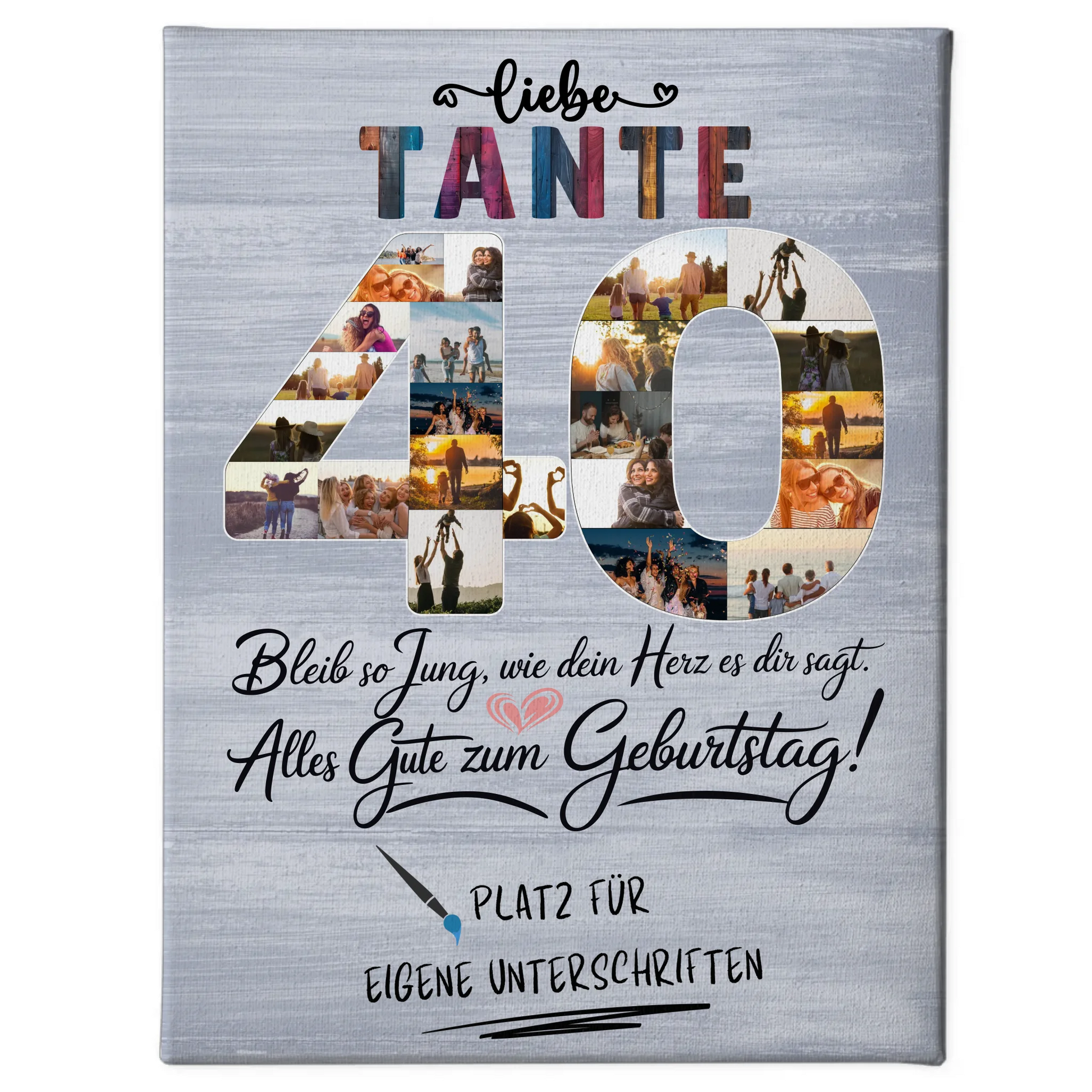 Suchst du ein einzigartiges und persönliches Geschenk zum 40. Geburtstag deiner Tante? Dann ist unsere personalisierte Fotoleinwand Tante 40 Geburtstag mit Unterschriften genau das richtige für dich! Dieses besondere Kunstwerk bietet zahlreiche Möglichkeiten zur Individualisierung, sodass du die schönsten Erinnerungen auf kreative Art und Weise präsentieren kannst.