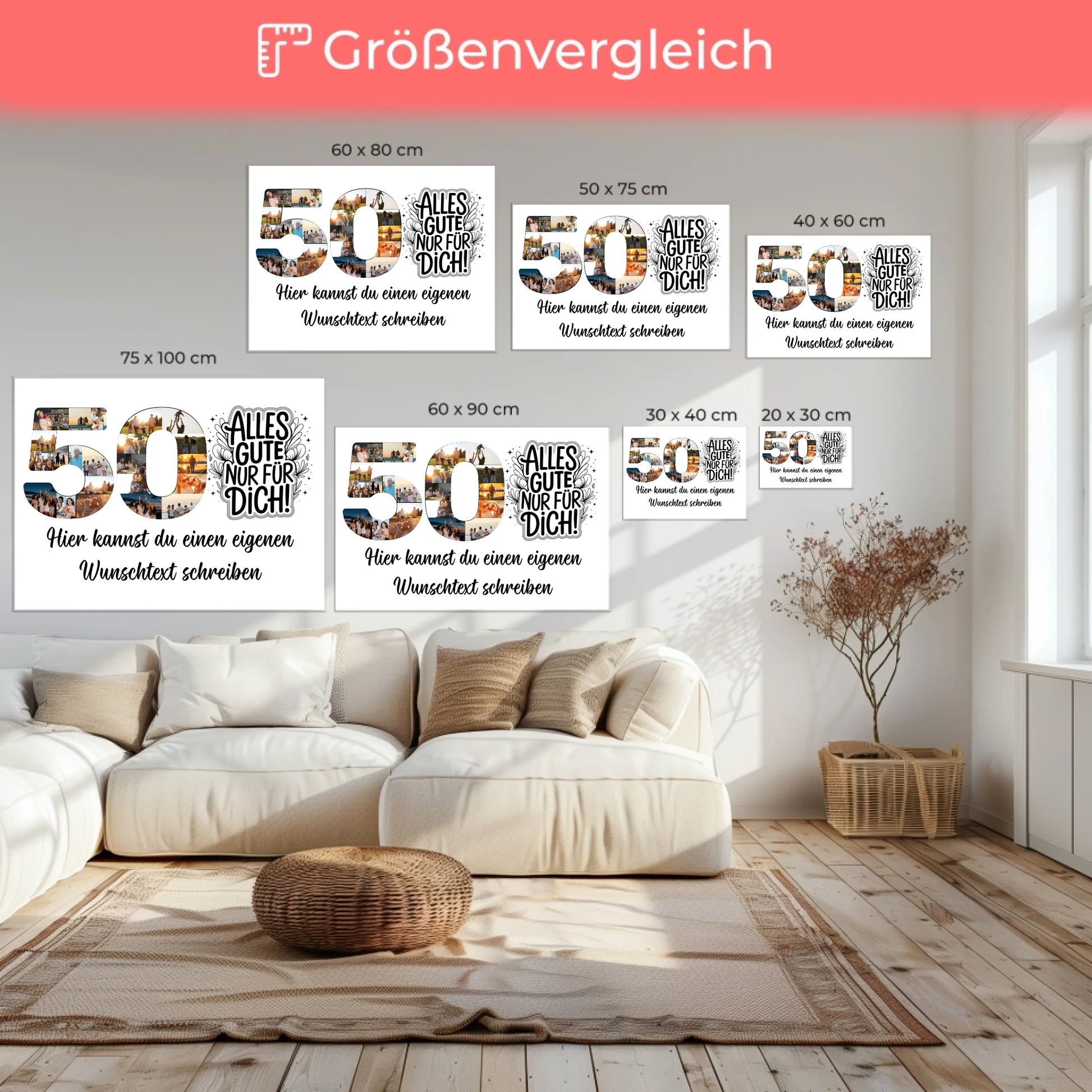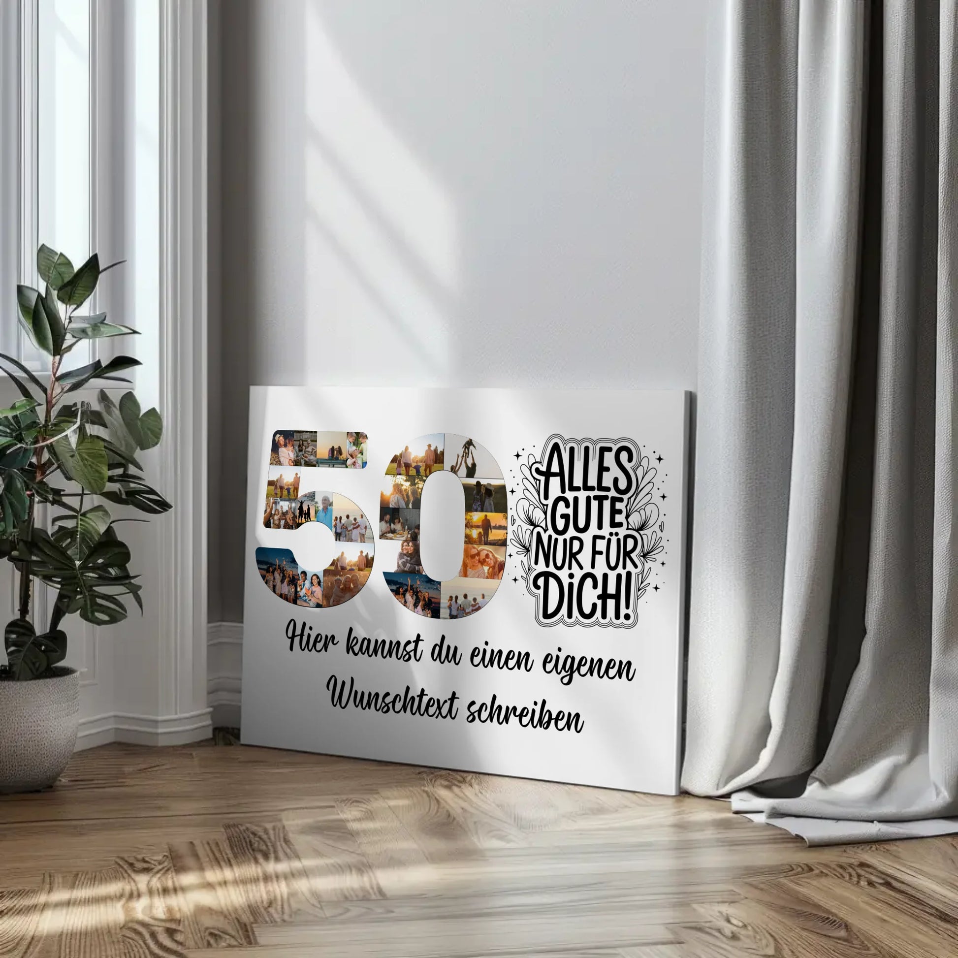 Feiere den besonderen 50. Geburtstag mit unserer einzigartigen, personalisierte Fotoleinwand Wunschtext 50 Geburtstag Alles Gute. Verwandle deine Erinnerungen in ein beeindruckendes Kunstwerk und schaffe ein unvergessliches Geschenk, das von Herzen kommt. Du kannst deinen eigenen Spruch oder Wunschtext hinzufügen und aus über 20+ Fotos sowie einem individuellen Hintergrundbild wählen.