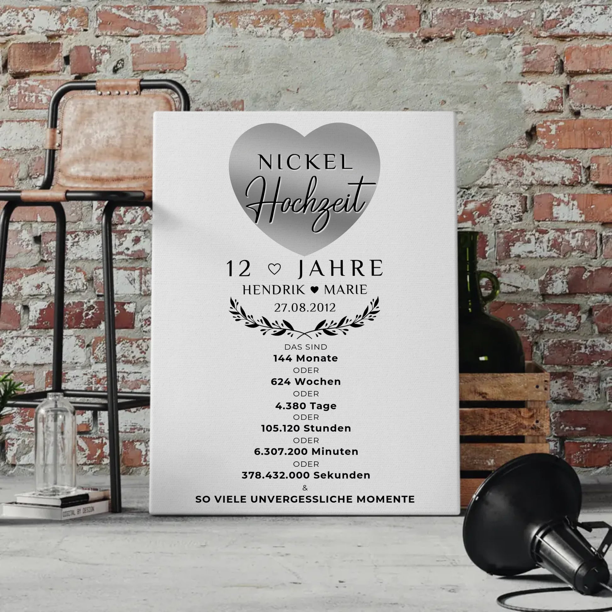 Feiere euren besonderen Tag mit einer einzigartigen personalisierte Fotoleinwand, die speziell für euren 12 Hochzeitstag entworfen wurde. Diese liebevolle Geschenkidee zur Nickelhochzeit ist das perfekte Geschenk für Hochzeitstag, um eure gemeinsamen Erinnerungen in einem stilvollen Rahmen festzuhalten.