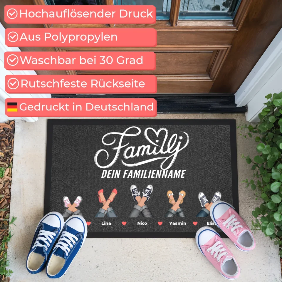 Du kannst die Fußmatte personalisieren und sie zu einem ganz besonderen Geschenk machen. Füge Bilder von euren Schuhen – sei es Sneakers, High Heels oder Boots – hinzu, sowie die Namen deiner Familie, einen eigenen Spruch oder Wunschtext und natürlich euren Familiennamen. So wird jede Fußmatte zu einem Unikat, das eure Individualität feiert.