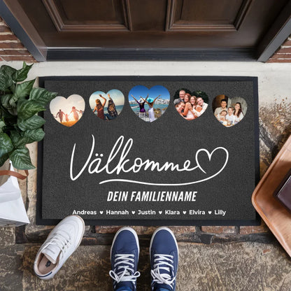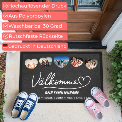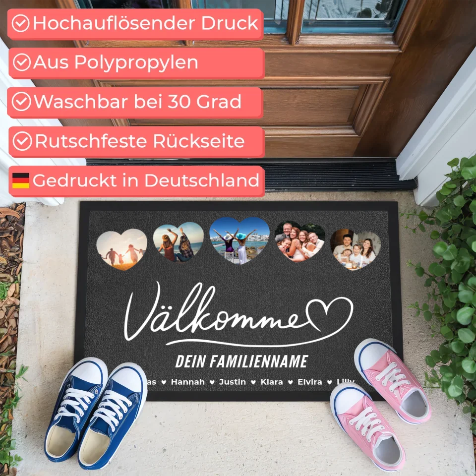 Bereite deinen Gästen einen herzlichen Empfang mit unserer personalisierten Fußmatte für Familien, die mit dem schönen schwedischen Spruch "Välkommen" verziert ist. Diese einzigartige Fußmatte bietet dir die Möglichkeit, deine Kreativität auszuleben und dein Zuhause noch persönlicher zu gestalten. Du kannst 5 Fotos, eure Namen, den Familiennamen und einen eigenen Spruch oder Wunschtext hinzufügen, um ein ganz individuelles Geschenk zu kreieren.