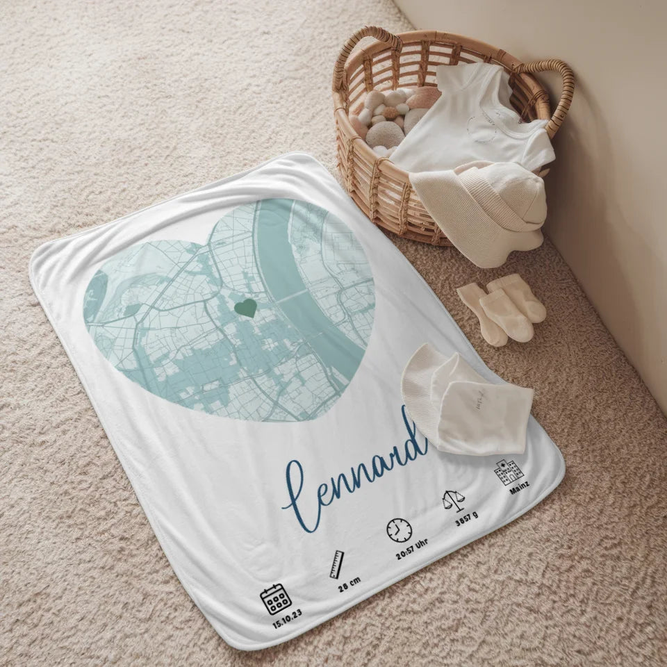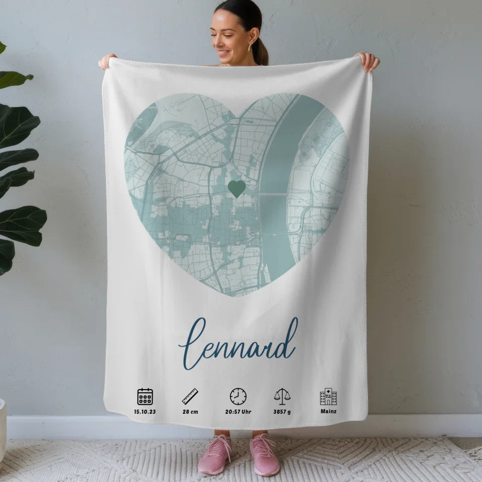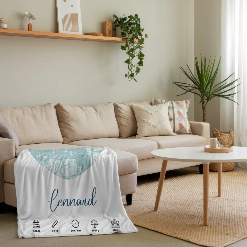 Personalisierte Geburtsdecke Jungen mit Geburtsdaten und Geburtsort Karte Blau