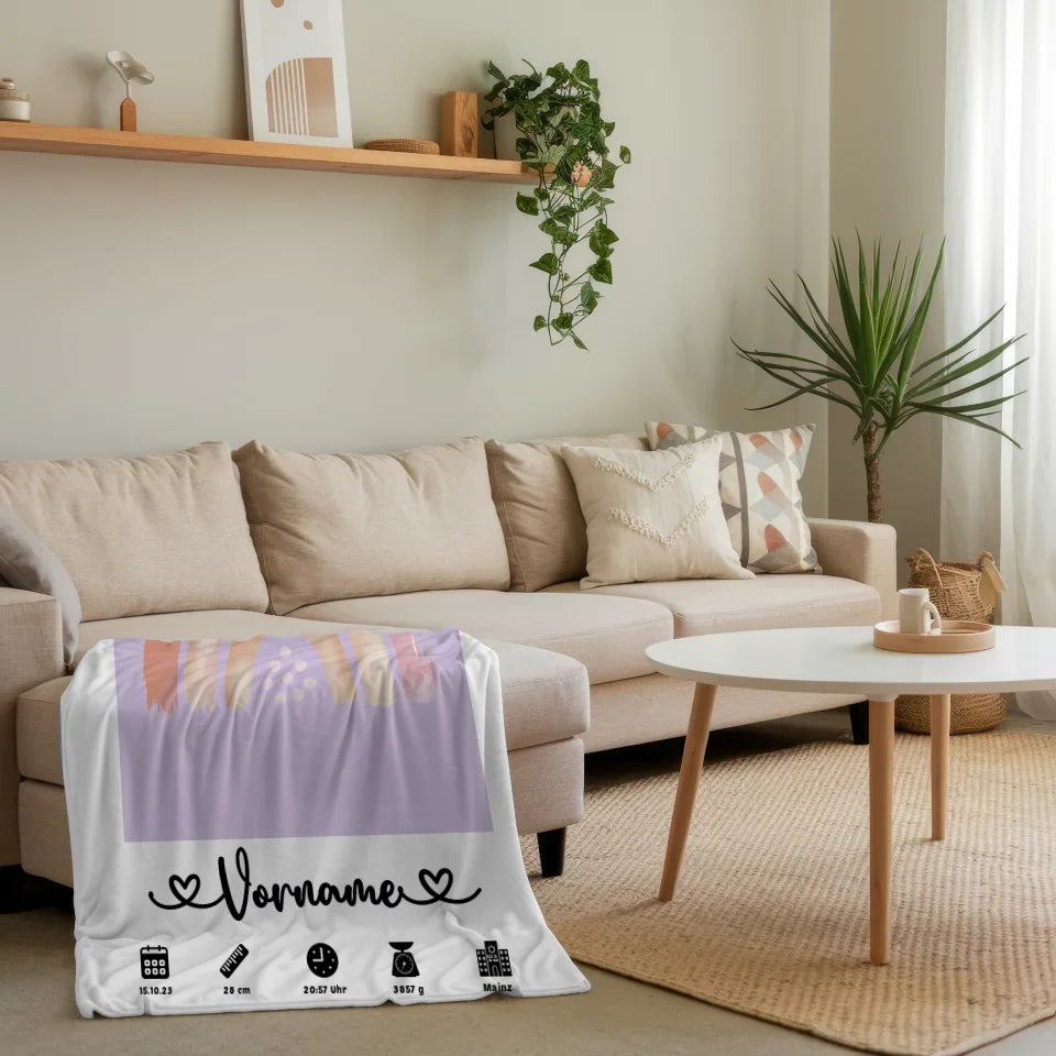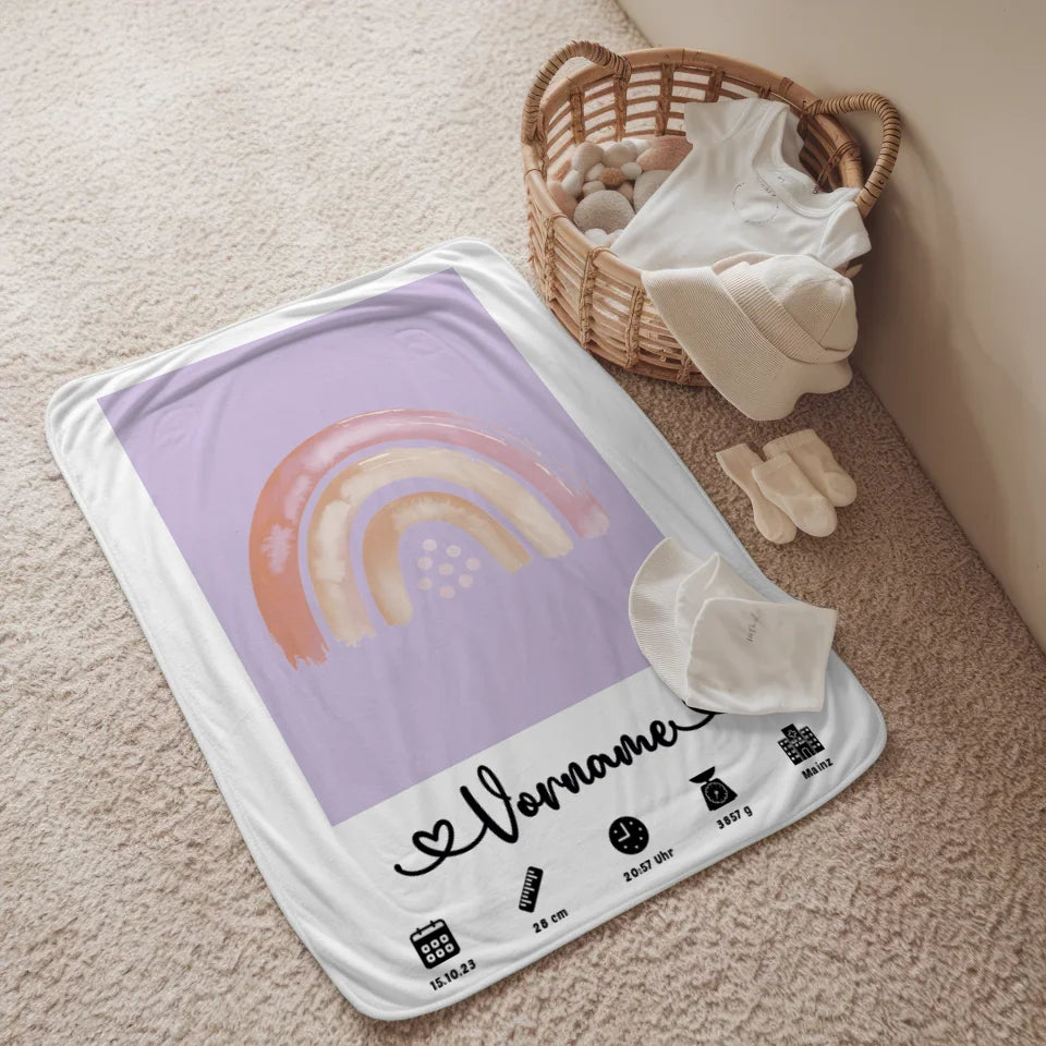 Personalisierte GeburtsDecke Regenbogen Beige Flieder mit Name – Ein einzigartiges Geschenk