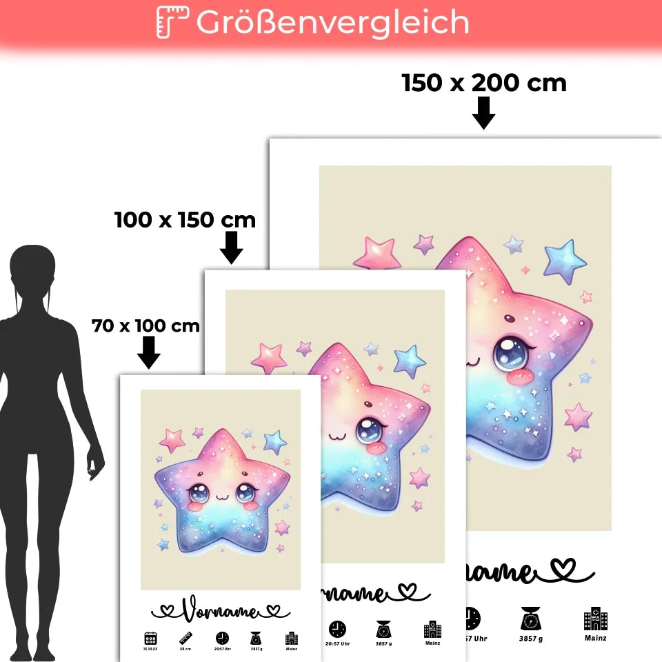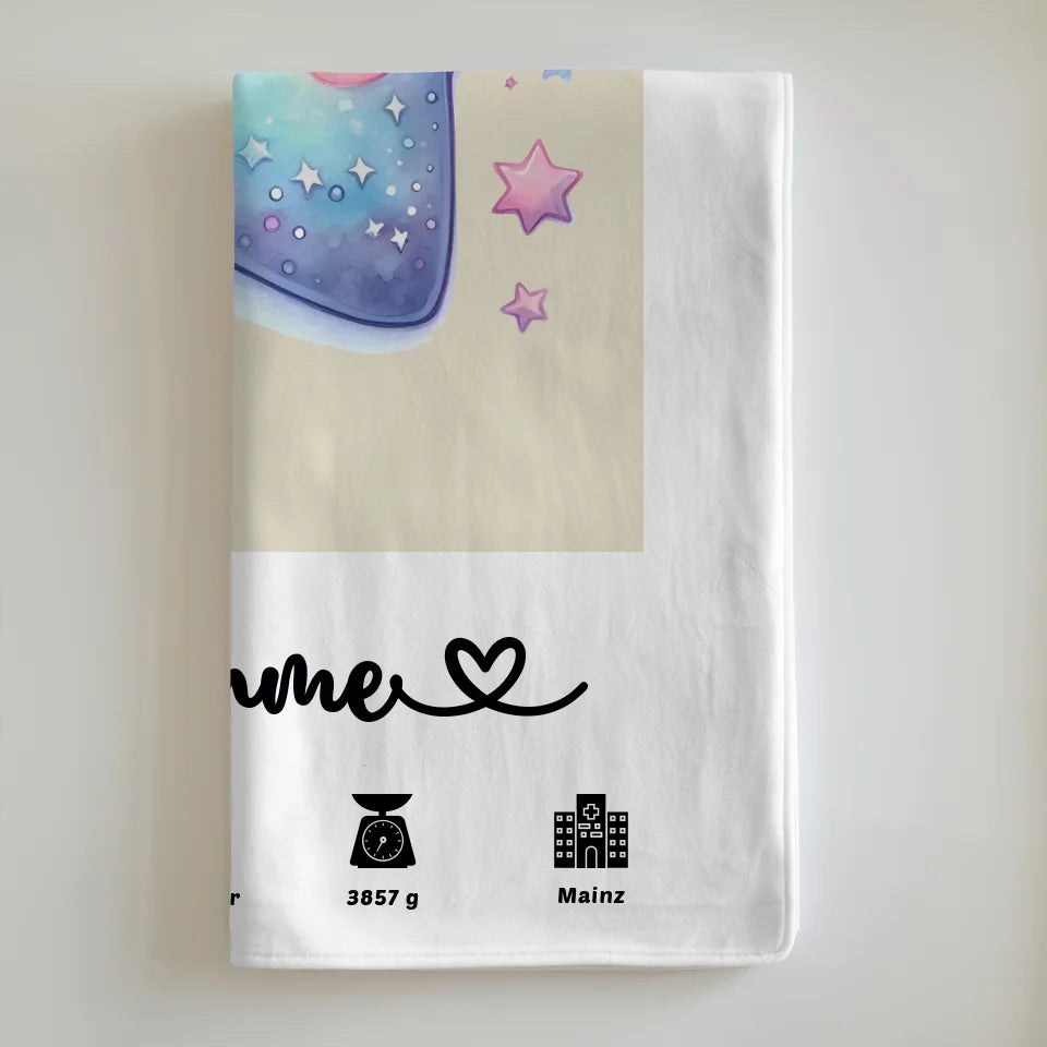 Die Geburtsdecke kann mit den wichtigsten Geburtsdaten wie Gewicht, Größe, Uhrzeit und Datum personalisiert werden. Außerdem kannst du den Namen deines Kindes hinzufügen! Das zauberhafte Hintergrundbild in Perlweiß und bunten Sternen macht die Decke zu einem echten Blickfang im Kinderzimmer und schafft eine gemütliche Atmosphäre.