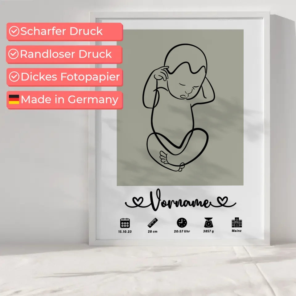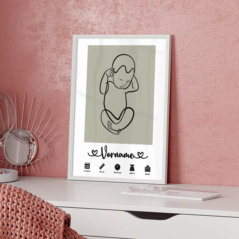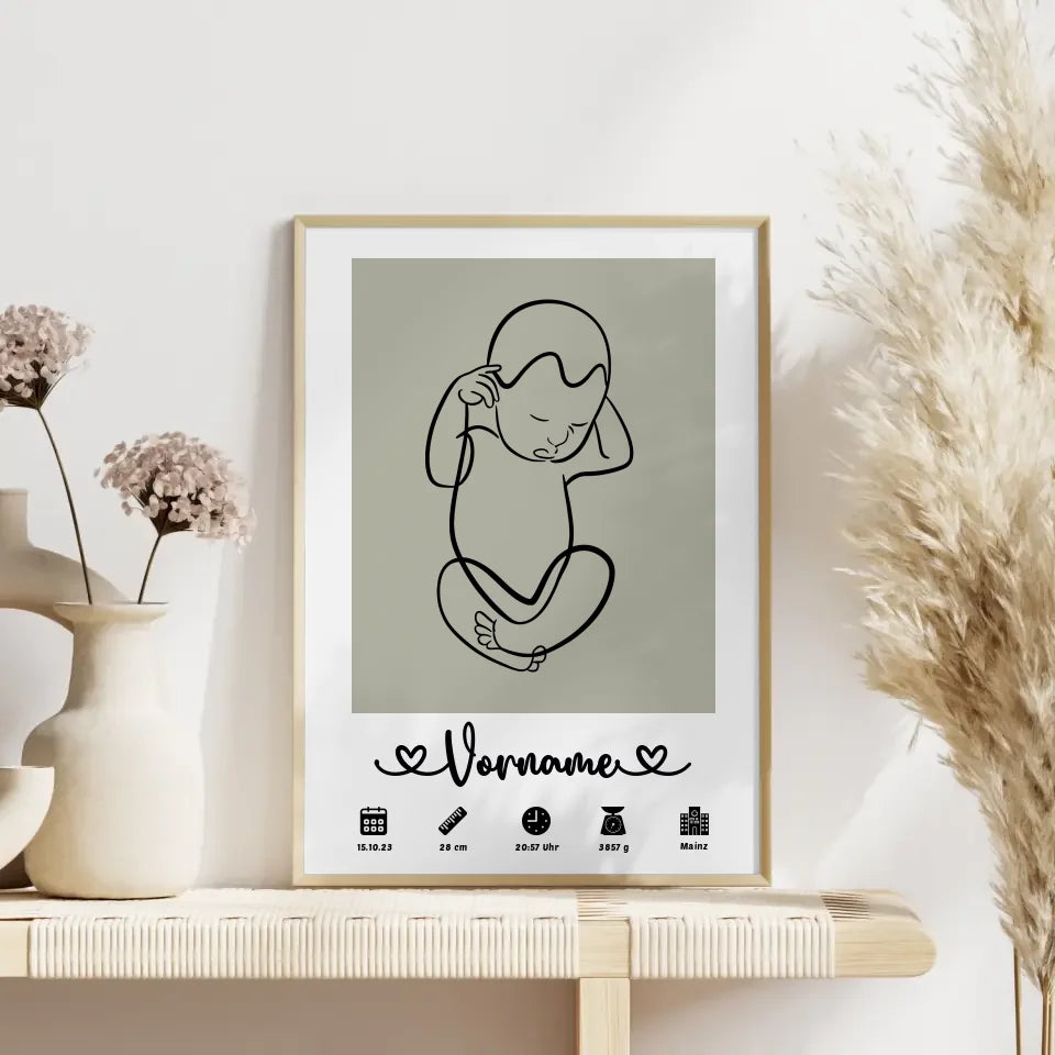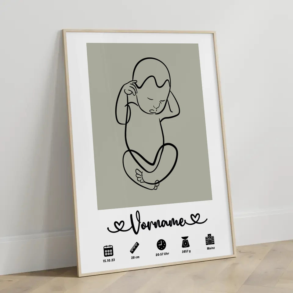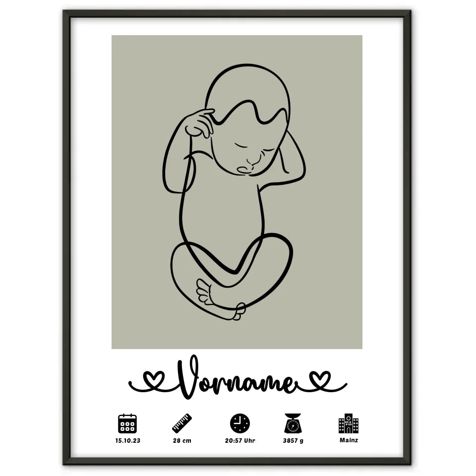 Personalisierte Geburtsposter mit Geburtsdaten Baby Lineart Grau mit Name