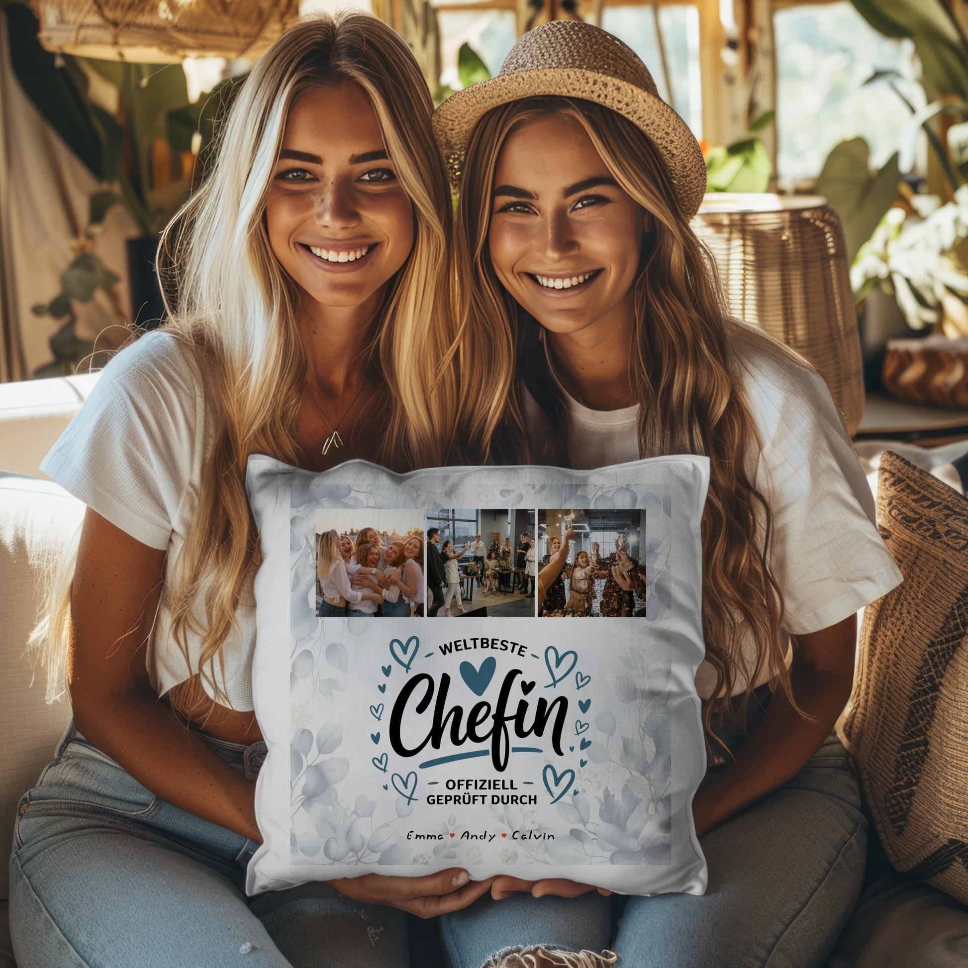 Personalisierte Geschenke für Chefin mit Namen Kissen Geschenk Fotocollage Weltbeste Chefin Offiziell Geprüft Durch
