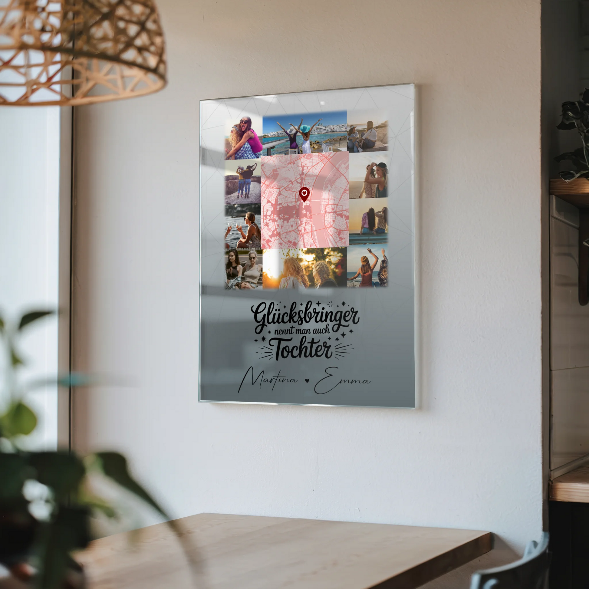 Überrasche deine Tochter oder einen lieben Bruder mit unserem einzigartigen personalisierten Geschenk: Personalisierte Geschenke mit Foto Mit Acrylglas 10 Fotos und Karte in der Mitte Glücksbringer Bruder. Dieses besondere Präsent vereint emotionale Erinnerungen, individuelle Gestaltungsmöglichkeiten und einen stilvollen Look. Du kannst bei diesem Geschenk deine Lieblingsfotos, einen eigenen Spruch oder Wunschtext, die Namen sowie eine Karte mit einem besonderen Ort hinzufügen, um es ganz persönlich zu machen. Das Design zeigt den schönen Spruch: „Glücksbringer nennt man auch Bruder“, was die Verbundenheit auf liebevolle Weise zum Ausdruck bringt. Ideal geeignet für jeden Anlass – sei es Geburtstag, Jubiläum, Weihnachten oder einfach, um deiner Tochter oder deinem Bruder eine besondere Freude zu bereiten. Die Fotocollage für Tochter wird durch die personalisierten Fotos noch emotionaler und einzigartig. Dieses personalisierte Poster ist nicht nur ein Blickfang, sondern auch ein wertvolles Erinnerungsstück, das immer wieder Freude bereitet. Schenke ein individuelles Geschenk, das Herzen berührt und bleibende Erinnerungen schafft – perfekt für jeden Anlass und für die wichtigsten Menschen in deinem Leben.