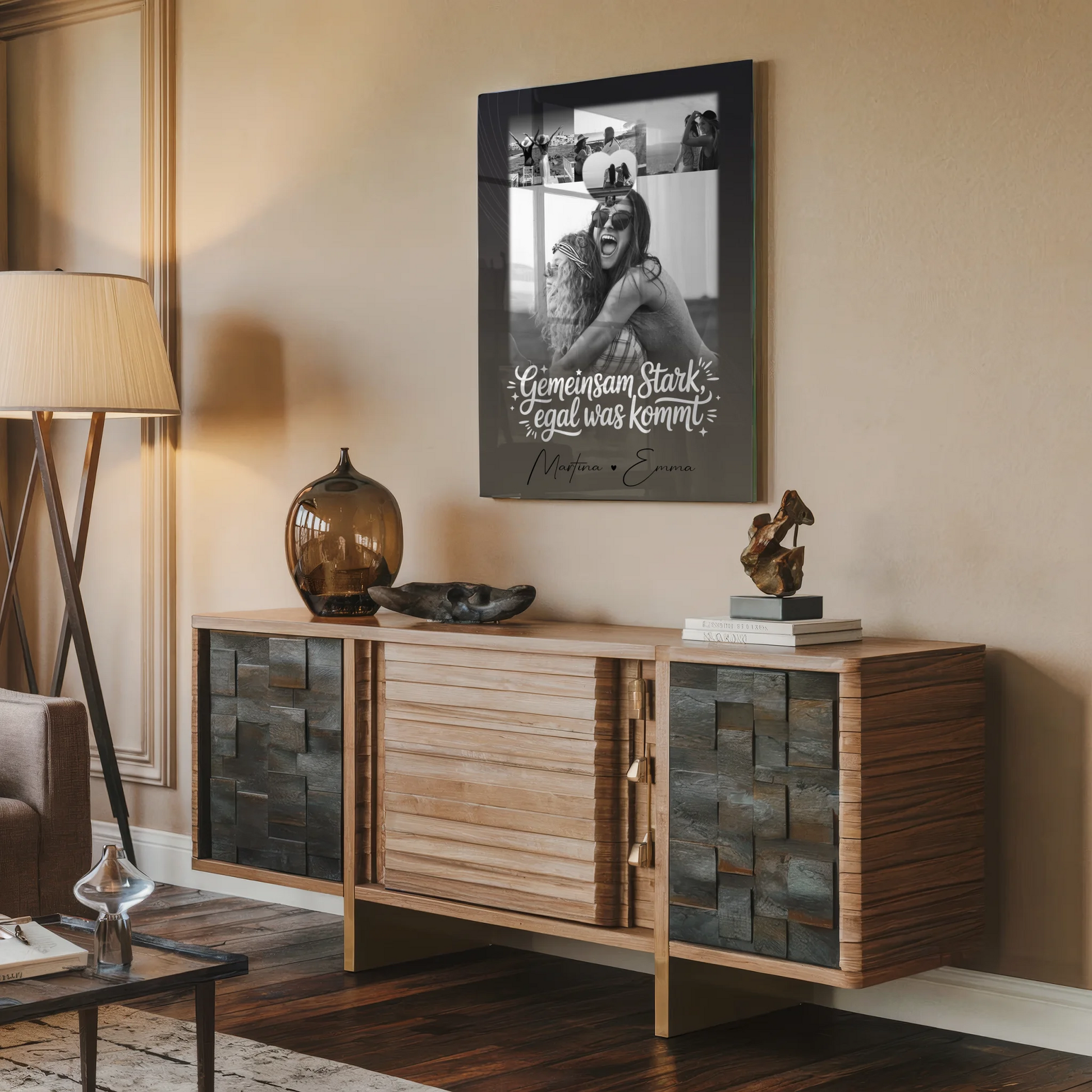 Ăberrasche deine Schwester zum Geburtstag mit einem einzigartigen und persönlichen Geschenk, das eure besondere Verbindung widerspiegelt. Das Produkt âPersonalisierte Geschenke mit Foto Mit Acrylglas 4 Fotos und 1 Kleines Herz Foto Gemeinsam stark egal was kommtâ ist die perfekte Wahl, um deine Liebe und UnterstĂŒtzung auf stilvolle Weise zu zeigen. Dieses individuell gestaltbare Acrylglas-Design bietet Platz fĂŒr 5 Fotos, einen eigenen Spruch oder Wunschtext sowie die Namen, sodass du dein Geschenk ganz nach deinen Vorstellungen anpassen kannst. Das schöne Design mit dem Spruch âGemeinsam stark, egal was kommtâ macht dieses Geschenk zu einem emotionalen Highlight, das deine Schwester garantiert begeistern wird. Ob zum Geburtstag oder einem anderen besonderen Anlass â dieses personalisierte Acrylglas ist ein Ausdruck deiner WertschĂ€tzung und Verbundenheit. Gestalte dein einzigartiges Geschenk einfach online, lade deine Lieblingsfotos hoch, fĂŒge einen persönlichen Wunschtext und die Namen hinzu, und schon erhĂ€lt deine Schwester ein unvergessliches PrĂ€sent, das sie immer an eure gemeinsame StĂ€rke erinnert. Perfekt geeignet fĂŒr alle, die ihre Liebe und UnterstĂŒtzung auf kreative Weise zeigen möchten. Mache den Geburtstag deiner Schwester zu einem unvergesslichen Erlebnis mit einem personalisierten Geschenk, das von Herzen kommt!