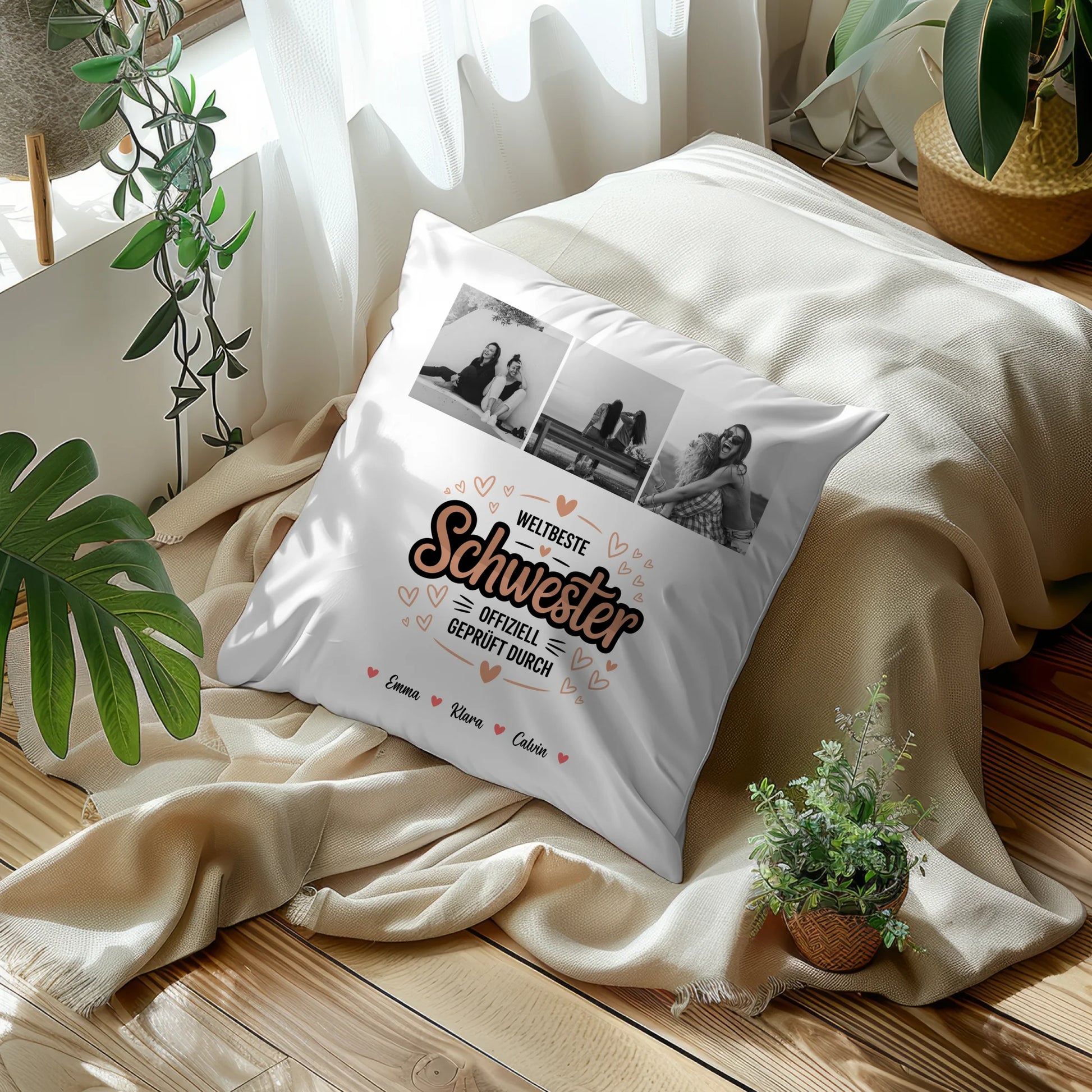 Personalisierte Kissen Große Schwester mit Schwester Fotocollage Weltbeste Schwester Offiziell Geprüft Durch