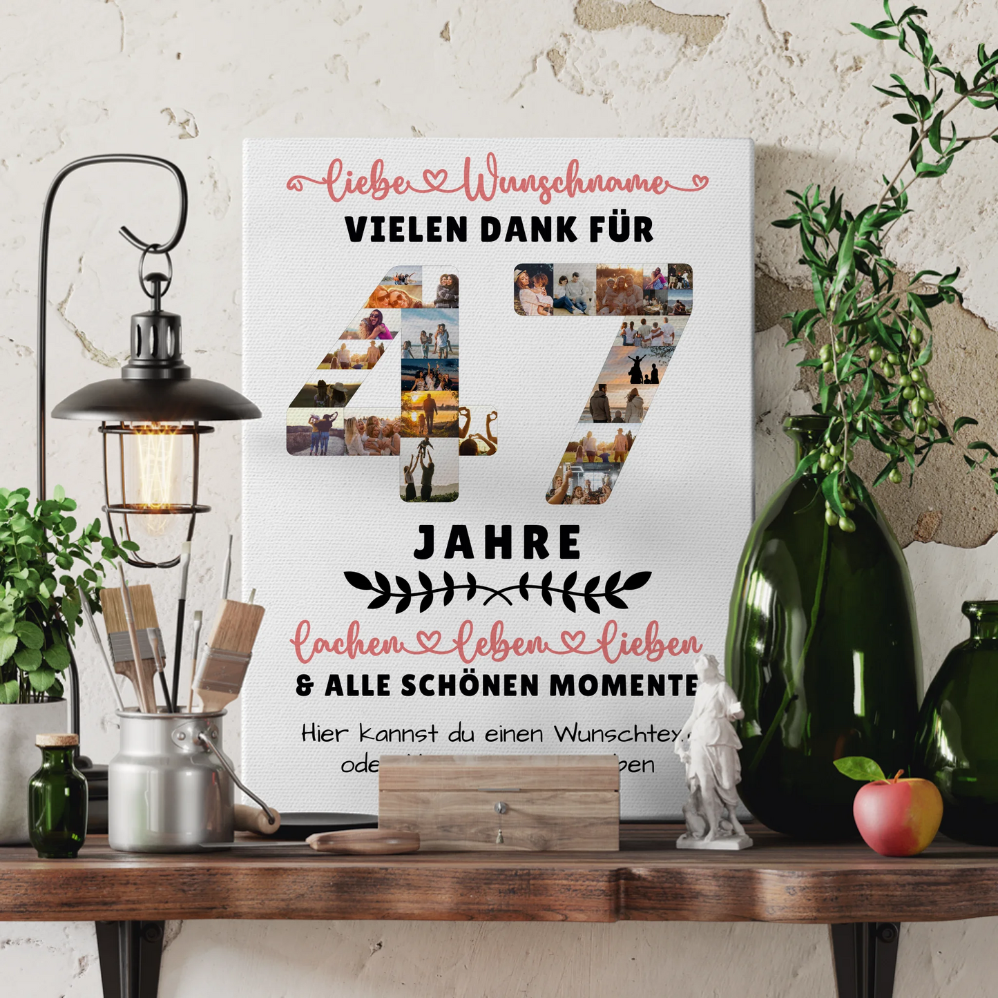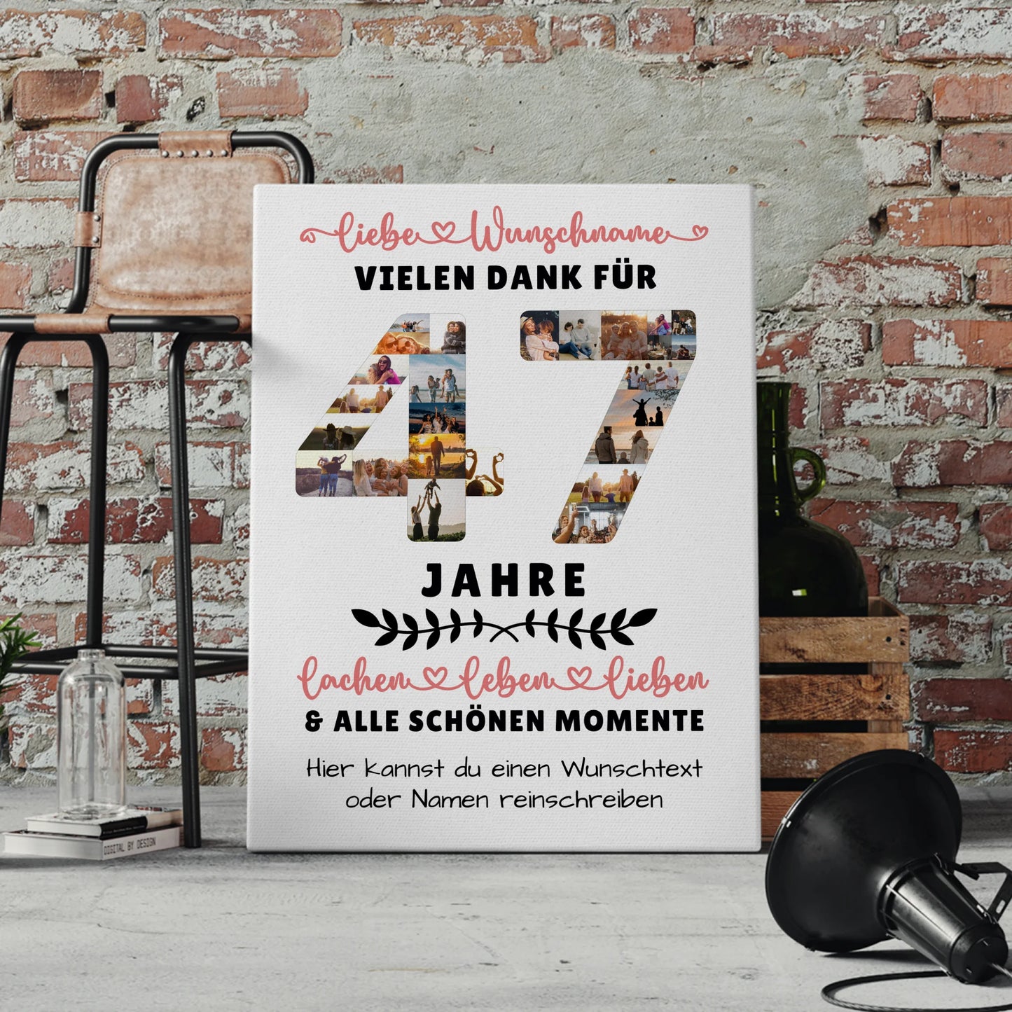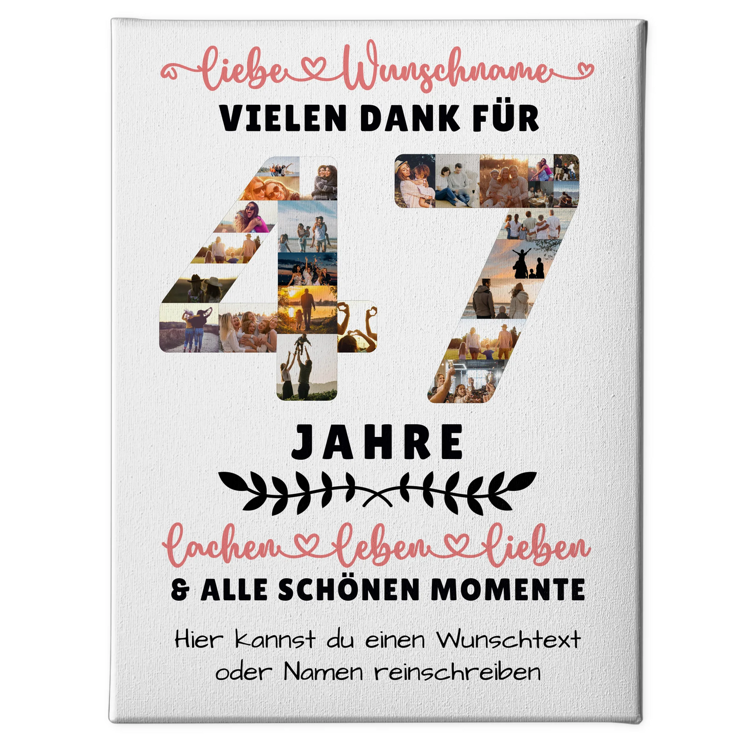 Überrasche deine Liebsten mit einer einzigartigen und persönlichen Geschenkidee: der Personalisierte Leinwand 47 Geburtstag Für Papa Mama Bruder & Schwester. Dieses individuell gestaltbare Wandbild ist das ideale Geschenk, um den besonderen Tag unvergesslich zu machen. Du kannst bei diesem Geschenk mehr als 20 Fotos, den Namen, einen Wunschtext sowie ein Hintergrundbild nach deinen Wünschen hochladen und so eine ganz persönliche Erinnerung schaffen. Die Personalisierte Leinwand ist perfekt geeignet für den 47 Geburtstag von Papa, Mama, Bruder, Schwester oder auch für andere Familienmitglieder wie Sohn, Tochter, Oma, Opa, Tante oder beste Freundin. Zeige deine Wertschätzung und Liebe durch ein einzigartiges Präsent, das garantiert begeistert. Ob für den Vater zum Geburtstag oder die Mutter zum besonderen Ehrentag – diese personalisierte Leinwand macht jeden Anlass zu etwas Besonderem. Mit ihrer hochwertigen Verarbeitung und individuellen Gestaltung wird sie zum Blickfang in jedem Zuhause und sorgt für langanhaltende Freude. Mach diesen Geburtstag unvergesslich mit einem persönlichen Geschenk, das genau auf die Wünsche deiner Familie abgestimmt ist – die Personalisierte Leinwand 47 Geburtstag Für Papa Mama Bruder & Schwester ist die perfekte Wahl für alle Anlässe im Familienkreis.