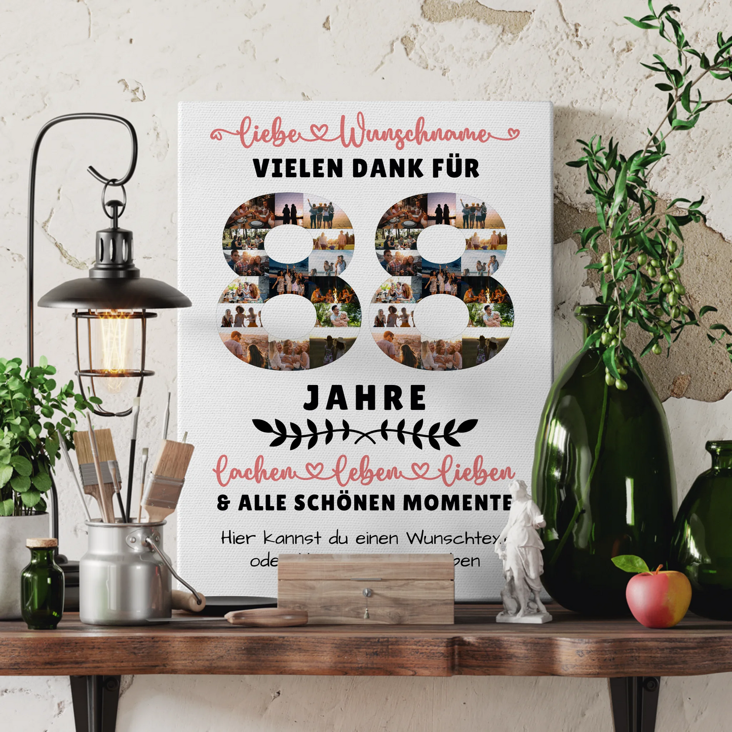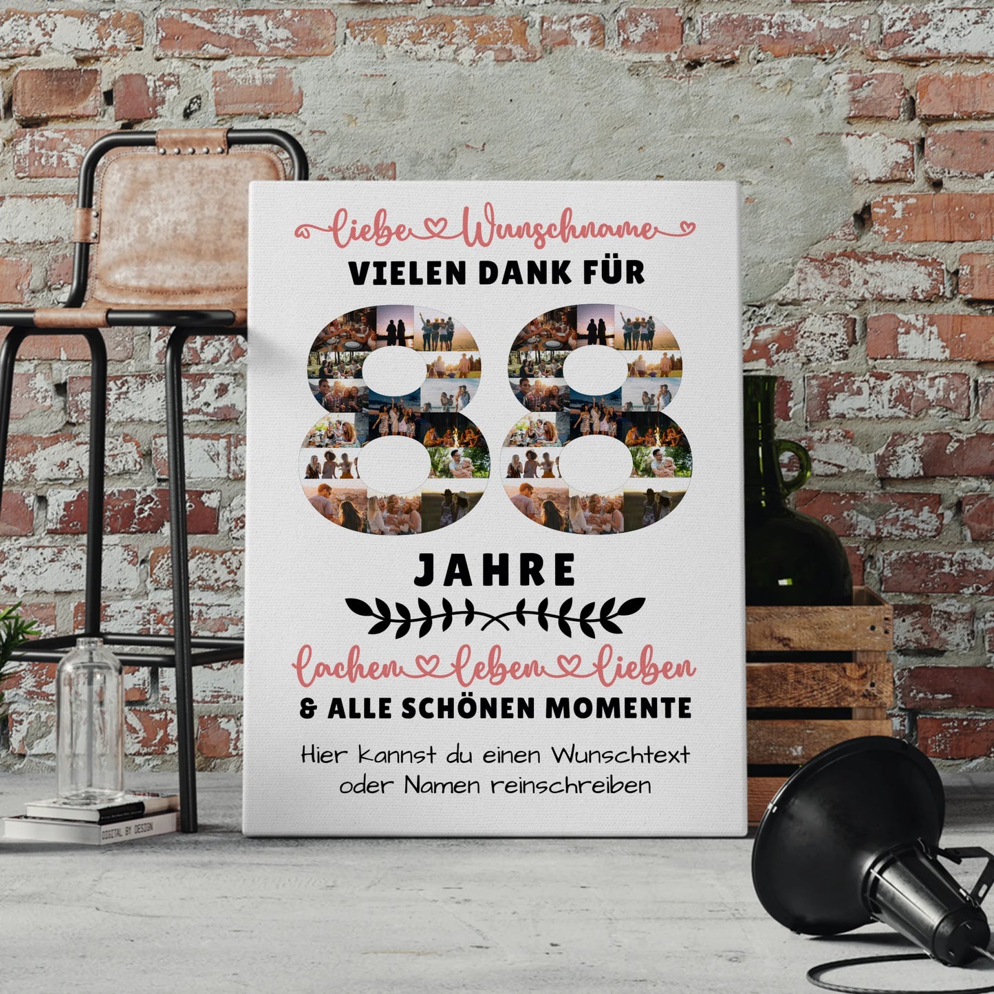 Überrasche deine Liebsten mit einer einzigartigen und persönlichen Geste: der Personalisierte Leinwand 88 Geburtstag Für Oma Opa Mama & Papa. Dieses besondere Geschenk ist ideal, um den runden Geburtstag deiner Familie unvergesslich zu machen. Du kannst die Leinwand ganz individuell gestalten, indem du über 20+ Fotos, den Namen, einen Wunschtext sowie ein Hintergrundbild hochlädst. So entsteht ein einzigartiges Erinnerungsstück, das garantiert für Freude sorgt.