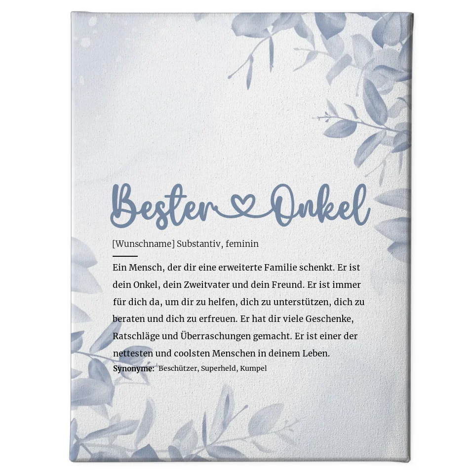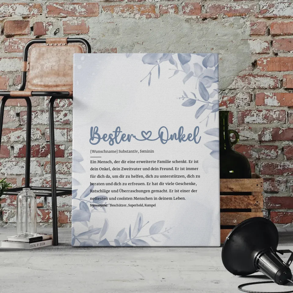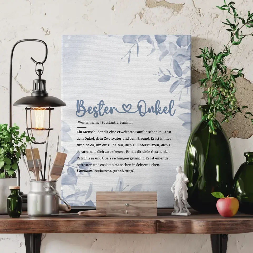 Die Leinwand ist nicht nur ein tolles Deko-Element, sondern auch ein Ausdruck Deiner Liebe und Wertschätzung. Ob zum Geburtstag oder zu Weihnachten, mit dieser personalisierten Leinwand schaffst Du unvergessliche Erinnerungen. Verleihe der Definition des besten Onkels eine ganz persönliche Note, indem Du sein Name in das herzliche Design integrierst.