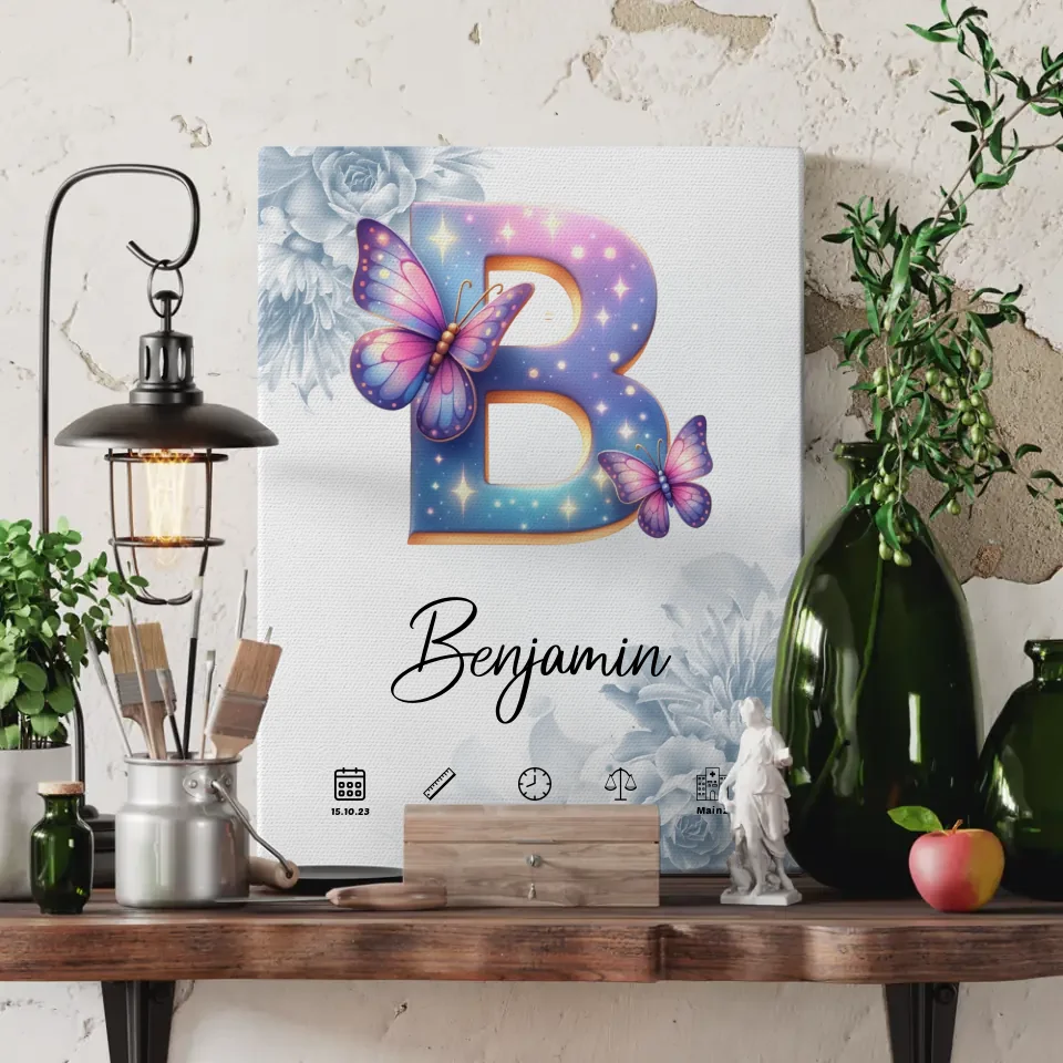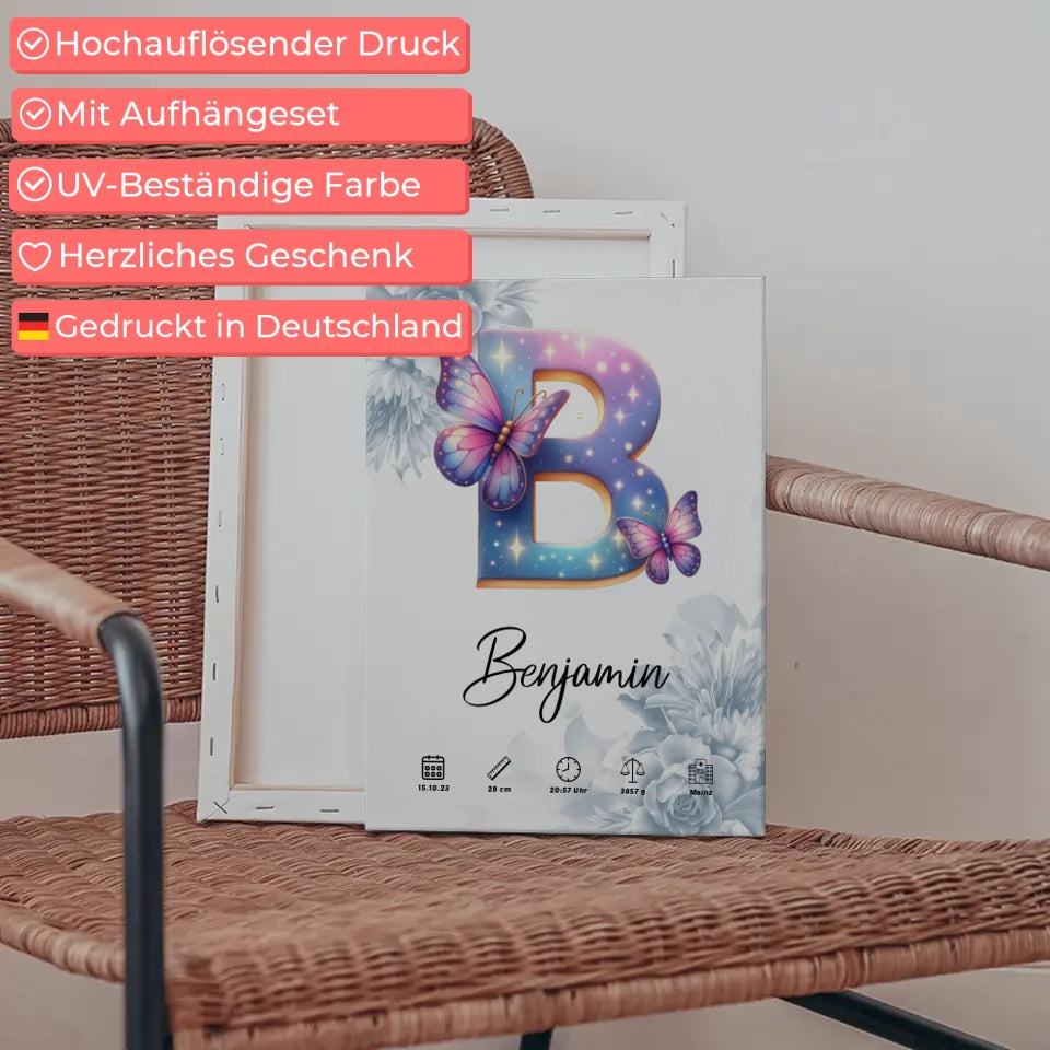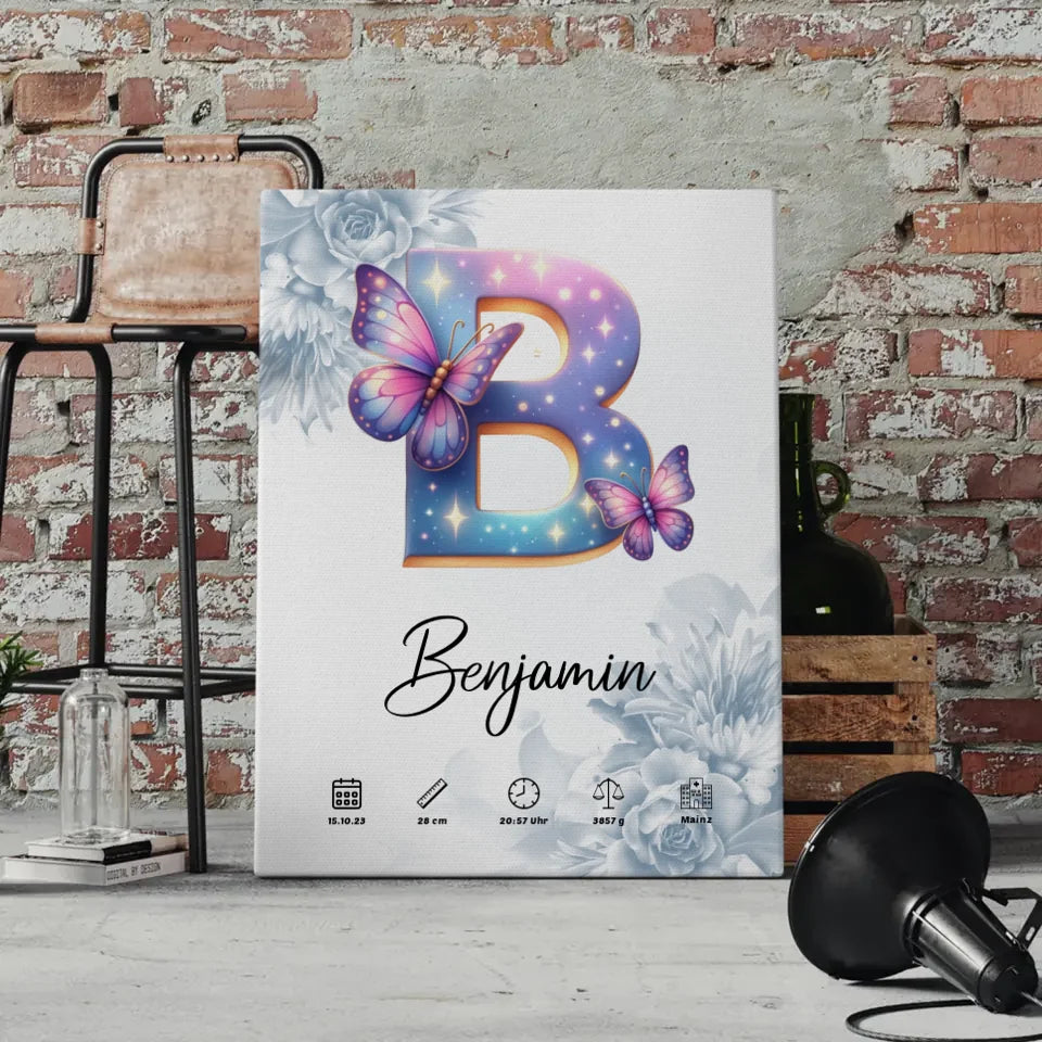Die Kombination aus zarten Blüten in Blau und dem markanten Buchstaben B verleiht der Leinwand einen harmonischen und eleganten Look. Egal ob für ein neugeborenes Baby oder als Geburtstagsgeschenk für ein Kleinkind, diese Leinwand ist eine wundervolle Erinnerung, die über Jahre hinweg geschätzt wird. Das personalisierbare Design macht sie perfekt für jeden Anlass, sei es zur Feier der Geburt oder zum Geburtstag eines geliebten Menschen.